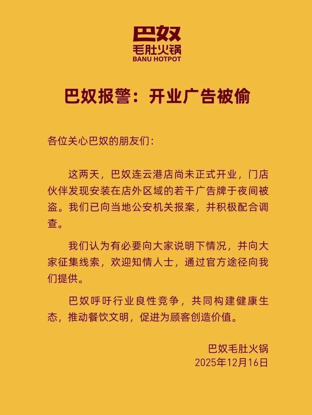 这两天,巴奴连云港店尚未正式开业,门店伙伴发现安装在店外区域的若干广告牌于夜间被盗。我们已向当地公安机关报案,并积极配合调查。