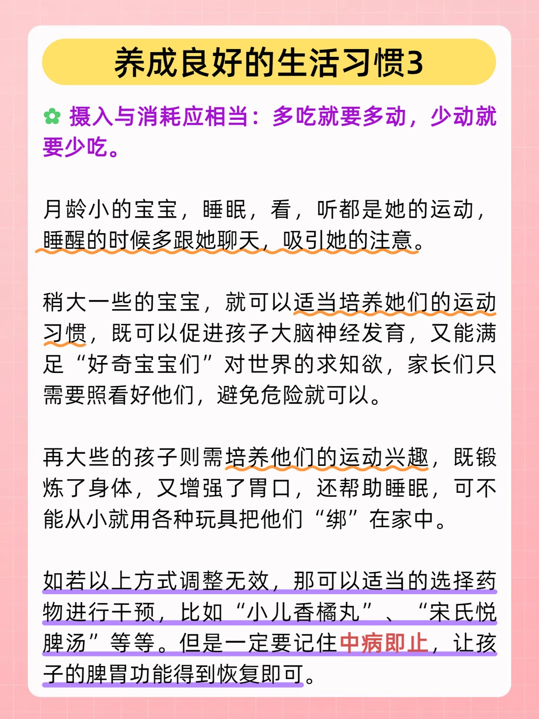 [种草R]如若以上方式调整无效,那可以适当的选择药物进行干预。比如“小儿香橘丸”、“宋氏悦脾汤”等等。[打卡R]但是一定要记住中病即止,让孩子的脾胃功能得到恢复即可。