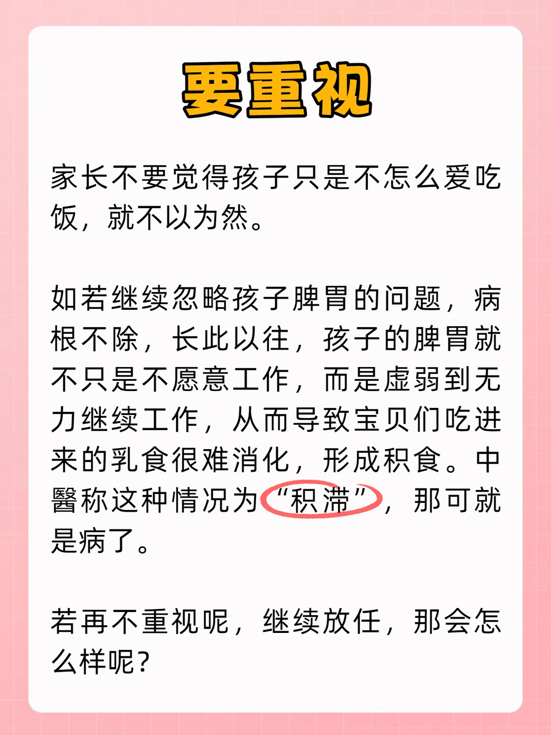 如若继续忽略孩子脾胃的问题,病根不除,长此以往,孩子的脾胃就不只是不愿意工作,而是虚弱到无力继续工作,从而导致宝贝们吃进来的乳食很难消化,形成积食。中醫称这种情况为“积滞”,那可就是病了。