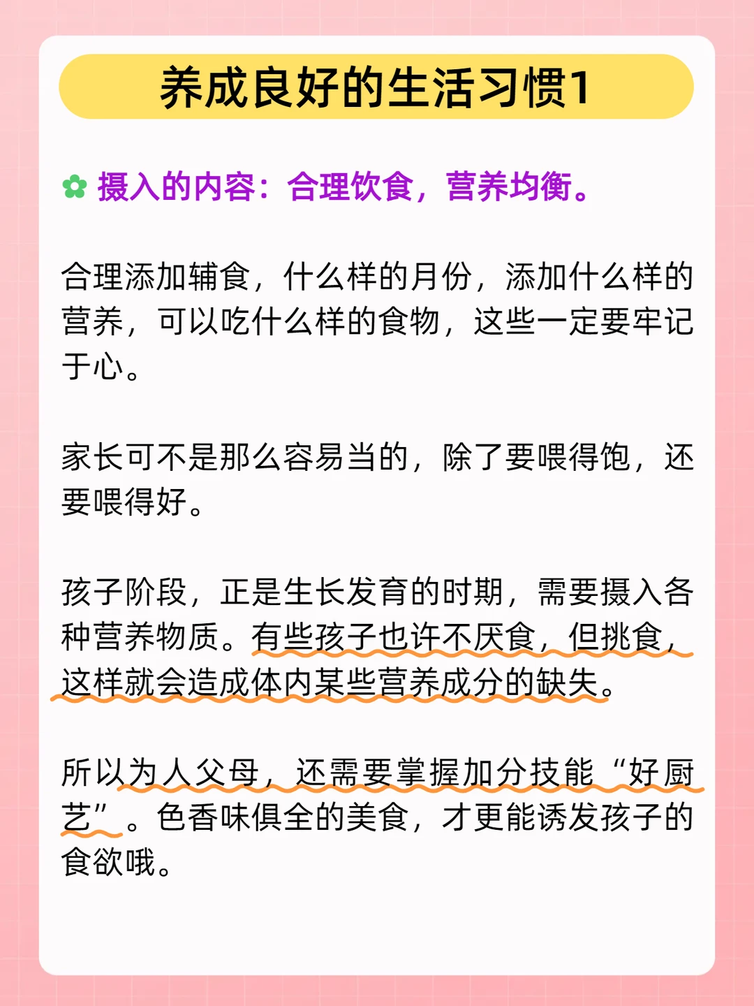 孩子阶段,正是生长发育的时期,需要摄入各种营养物质。有些孩子也许不厌食,但挑食,这样就会造成体内某些营养成分的缺失。