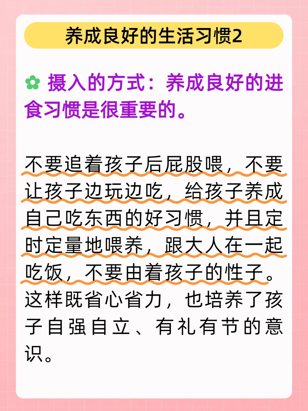 不要追着孩子后屁股喂,不要让孩子边玩边吃,给孩子养成自己吃东西的习惯,并且定时定量地喂养,跟大人在一起吃饭,不要由着孩子的性子。