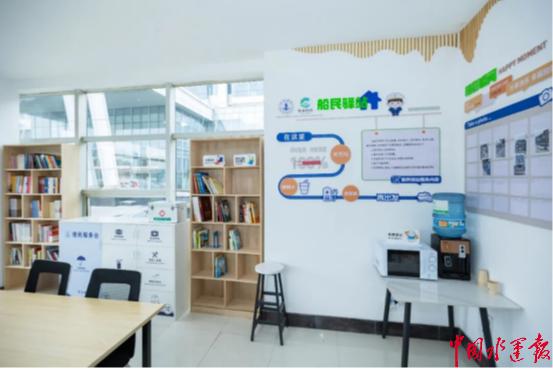 服务区位于常州市天宁区阳湖大桥西侧北岸。本次改造在原有船舶停泊、加油充电、污染物接收等功能的基础上,新增智能供水桩,并同步建成集船民超市、快递站点、便民阅读站于一体的多功能“船民驿站”。驿站内24小时热水供应,全区域覆盖免费WiFi;书架上报刊书籍陈列有序,空调、微波炉、充电插座、血压计等便民设施齐全,全面满足船员的日常补给与休憩需求。