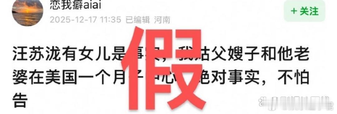 汪苏泷方否认孩子传闻汪苏泷方在相关贴文上打上大大的“假”字,否认:“假。”