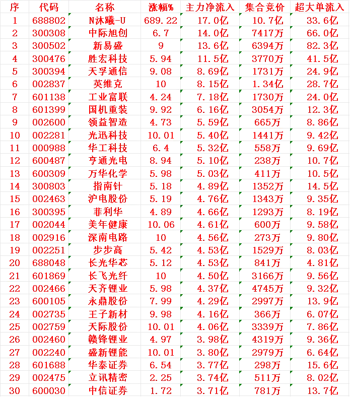 12月17日收盘,主力资金,已经大幅卖出的30名单:永辉超市:净流出17.5亿元航天电子:净流出16.3亿元平潭发展:净流出14.0亿元航天发展:净流出9.80亿元赛微电子:净流出7.46亿元通宇通讯:净流出6.49亿元北汽蓝谷:净流出6.18亿元雪人集团:净流出4.75亿元航天信息:净流出4.09亿元太阳电缆:净流出3.47亿元中国中免:净流出3.42亿元信维通信:净流出3.37亿元华菱线缆:净流出3.16亿元歌尔股份:净流出3.10亿元海峡创新:净流出3.08亿元12月17日收盘,主力资金“大幅买入”的30名单:N沐曦-U:净流入17.0亿元中际旭创:净流入14.0亿元新易盛:净流入13.6亿元胜宏科技:净流入11.5亿元天孚通信:净流入8.69亿元英维克:净流入8.15亿元工业富联:净流入7.18亿元国机重装:净流入6.16亿元领益智造:净流入5.59亿元光迅科技:净流入5.40亿元华工科技:净流入5.32亿元亨通光电:净流入5.10亿元万华化学:净流入5.03亿元指南针:净流入4.89亿元沪电股份:净流入4.76亿元