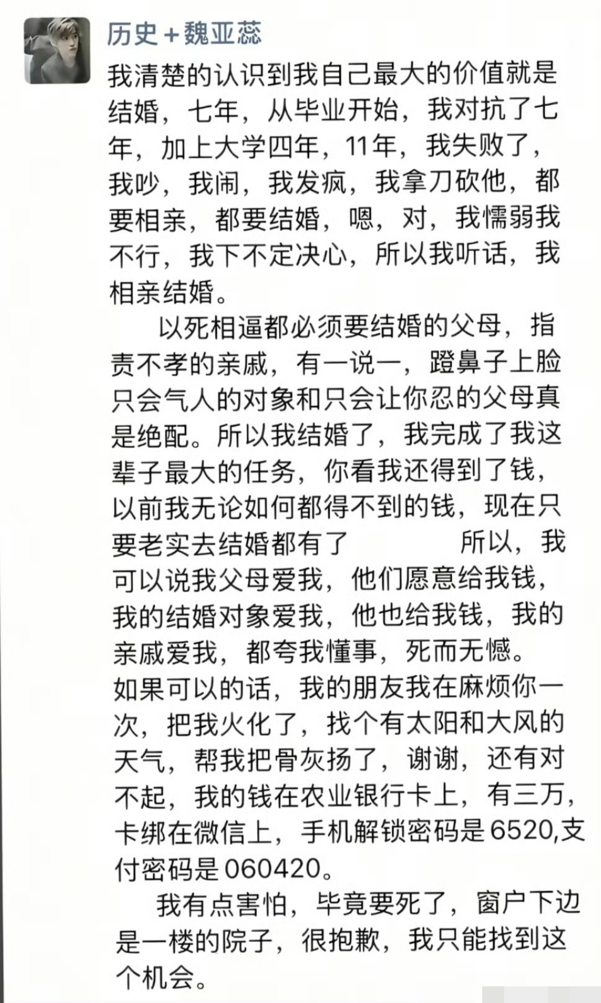 “我完成了最大任务”:女教师新婚坠亡,11年催婚悲剧谁之过? 河南鲁山,28岁的高中历史老师魏某,新婚当天借口换婚纱把所有人支开反锁7楼婚房的门,纵身一跃。 她最后一条朋友圈写着“我完成了我这辈子最大的任务。” 这个姑娘2022年考编笔试第一、综合第一,堂堂正正进了当地最好的高中当老师。学生说她温柔有风骨,1米7的个子。早上5点50分到校盯早读,晚上9点多才下班,一天最多上六七节课,从没带过一点不耐烦进教室。 可就是这么一个优秀的姑娘从17岁上大学开始,就被父母、亲戚摁着头催婚,一催就是11年。 婚礼前一天,她发朋友圈说要取消婚礼,礼金会一一退还。结果父母不同意,硬是逼着她把这场“任务式婚礼”办下去。 坠楼前,她发了长文遗言,字字泣血。骂以死相逼的父母,骂指责她不孝的亲戚,骂只会气人的未婚夫。她甚至还跟一楼的业主道歉,说“抱歉,我只能找到这个自杀的机会”。 更让人心寒的还在后面!她的遗体落在一楼院子里,足足放了24小时没人管。女方家说“女儿嫁出去了,该婆家负责”;男方家说“还没正式迎娶,不算一家人”。最后还是女方家属赔了3万块钱才把遗体送去殡仪馆。 警方通报是自杀,排除刑事案件。妇联说没收到过求助,教育局连夜给全县老师做心理疏导。村干部说她可能有抑郁症,11年的催婚压力是个人都得憋出病。 她在遗言里交代得明明白白:农行卡里有3万块钱,手机密码6520,拜托朋友把她火化,找个有太阳、有风的日子,把骨灰扬了。 她到死都想挣脱那些捆绑她的东西。 这到底是谁的悲剧?是父母的执念?是亲戚的碎嘴?还是把婚姻当成人生必修课的陈旧观念? 那个教学生“活成风骨”的老师,终究没能活成自己想要的样子。