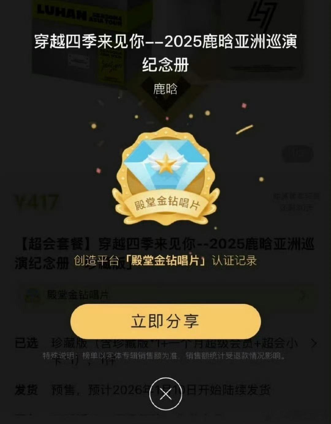 鹿晗四巡纪念册,🐧仅1分钟销售额破1500w+,达成殿堂金钻唱片! 一个半小时