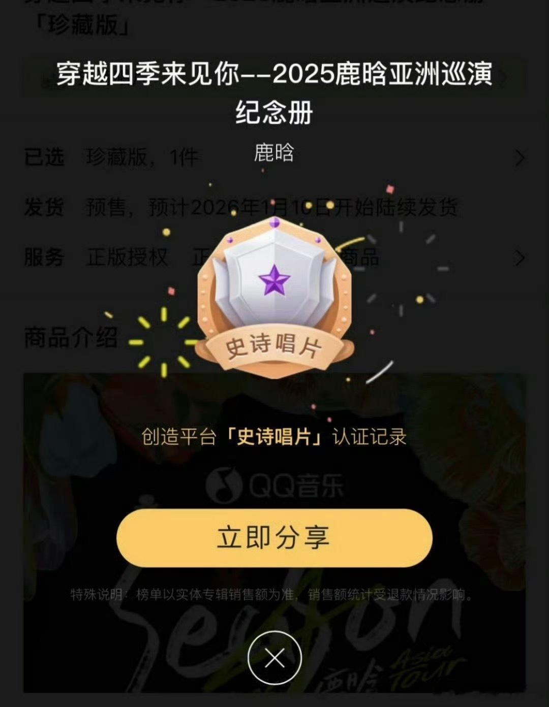 鹿晗四巡纪念册,🐧仅1分钟销售额破1500w+,达成殿堂金钻唱片! 一个半小时达成3000w销售额的史诗唱片