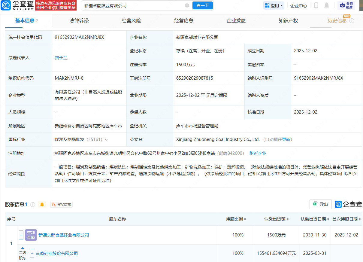 企查查APP显示,近日,新疆卓能煤业有限公司成立,法定代表人为贺长江,注册资本为1500万元,经营范围包含:煤炭及制品销售;煤炭洗选;煤制活性炭及其他煤炭加工;矿物洗选加工;选矿;煤炭开采等。企查查股权穿透显示,该公司由合盛硅业(603260)间接全资持股。