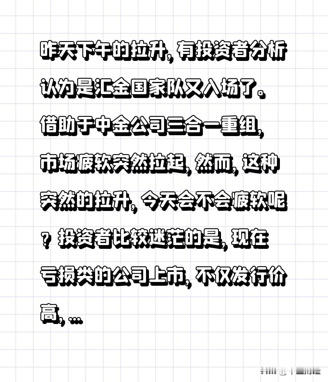 【A股今天】昨日午后的拉升,有投资者分析,或是汇金国家队再度入场护盘。借由中金公司三合一重组,疲软的市场陡然上扬。不过,这般突然的拉升,今日是否会再度疲软呢? 让投资者颇为迷茫的是,当下亏损类公司大量上市,不仅发行价高,且二级市场上市前期仅5%的流通股,利益驱使下推高泡沫的风险显著,还累积了后续95%解禁股的冲击。也有人称,炒作这类股票的不乏国家机构。那么,这种刻舟求剑、拔苗助长的浮夸与恶炒之风,会否给未来的股市发展带来灾难呢?