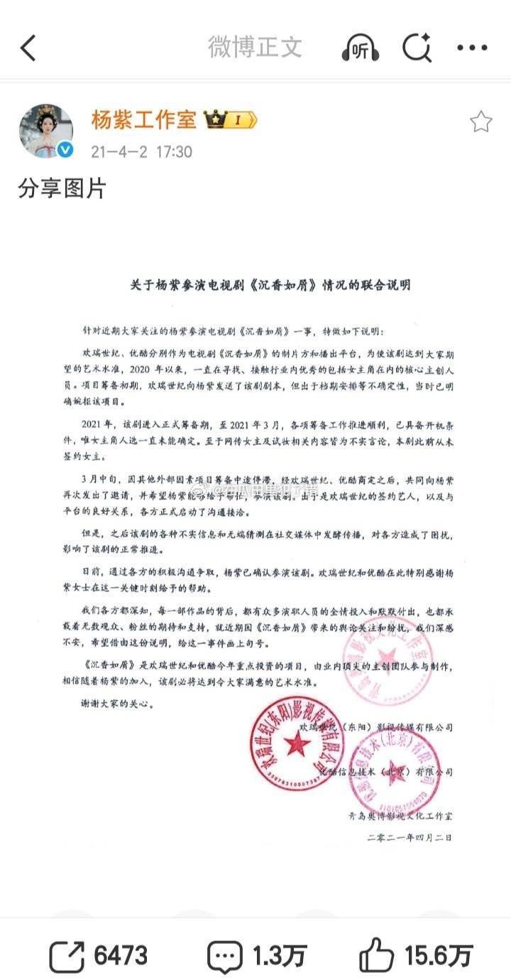 杨紫是合约正常到期不续约,跟解约无关,性质完全不同