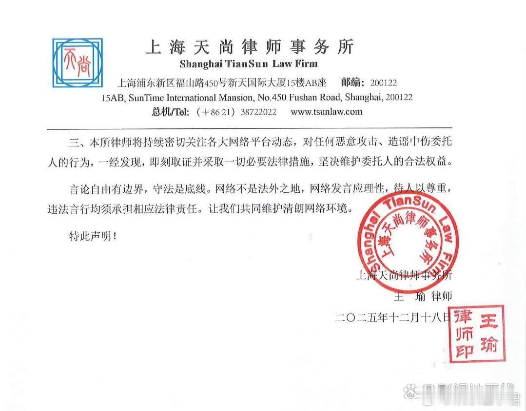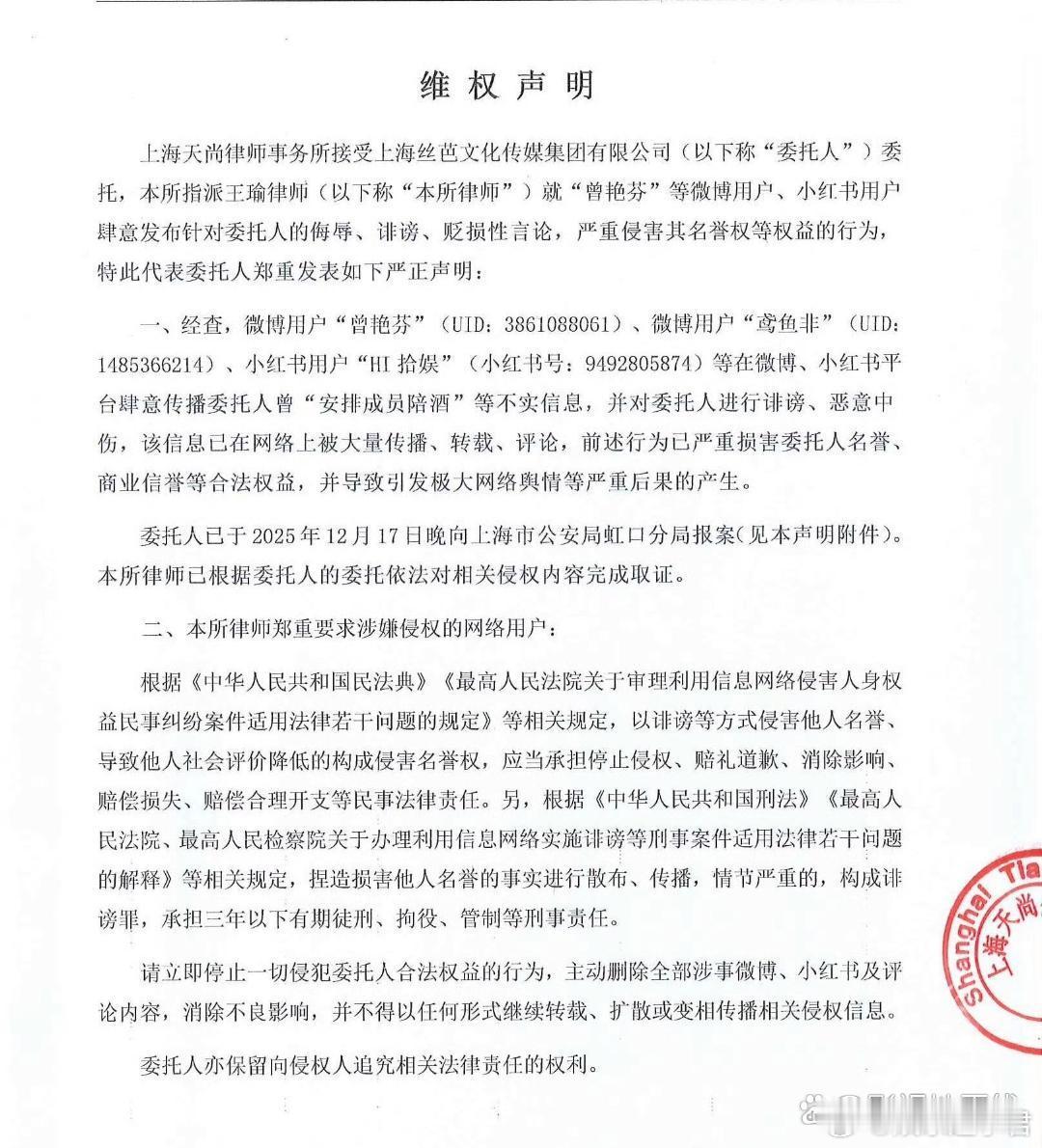 丝芭就曾艳芬陪酒言论报警丝芭委托律师事务所发布声明及报警回执,称曾艳芬等人发布“安排成员陪酒”等是不实信息,已于12月17日晚向上海市公安局虹口分局报案,律师已根据委托人的委托依法对相关侵权内容完成取证。