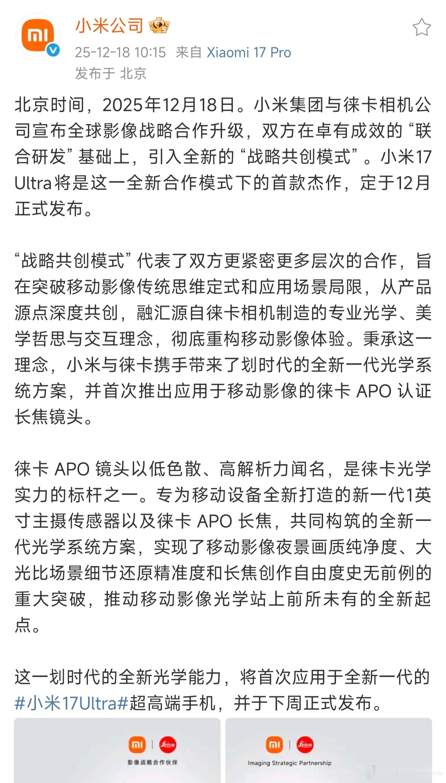 小米与徕卡合作升级这次合作升级又是大跨步,引入“战略共创模式”,感觉是小米和徕卡一起做手机,准确说是一起做手机的影像部分。期待小米17 Ultra新一代1英寸主摄+徕卡APO长焦,这可能是26年唯一。听说还有连续光变,2亿大底潜望长焦做连续光变,respect。赶紧放样张让大家看看吧。还有,听说这次合作新品不止一款,是不是网友一直期待的徕卡红标版呢?毕竟小米每出一代Ultra,就有用户喊着上徕卡小红标。当然我估计这次不止小红标,在设计上也会逼近原汁原味的徕卡相机味。哦,还有,之前传言小米要进军口袋相机领域,不知道也能不能与徕卡合作上。