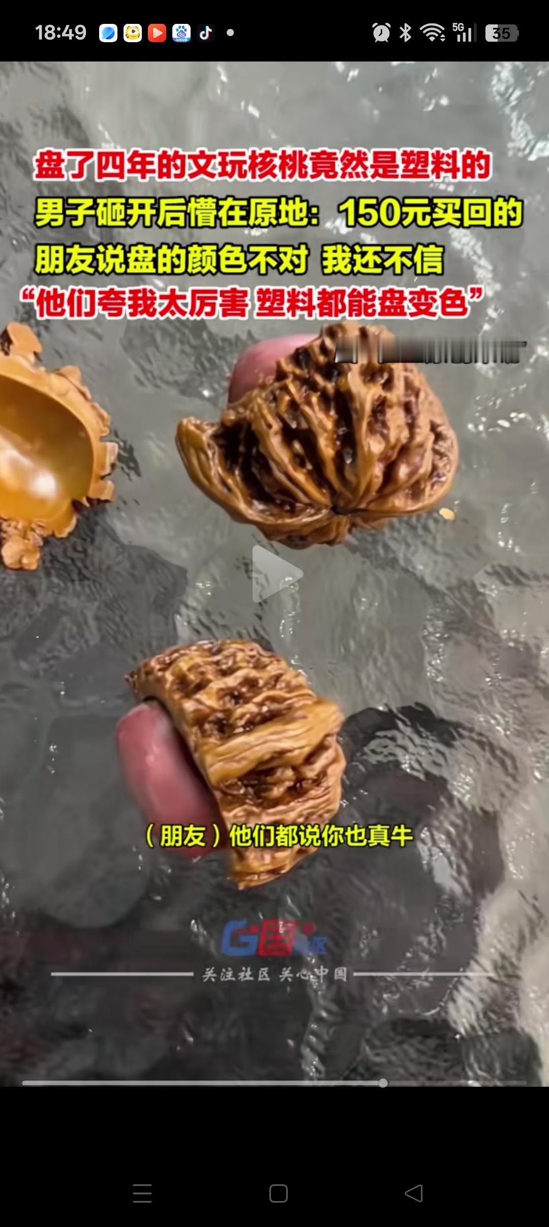 “伤害不高,但侮辱性极强”,河北唐山,男子盘了4年的文玩核桃,自认为是真的。但朋友仅一眼看出端倪,因为它都掉色了。于是提醒他砸开看看,免费整天拿在手上转丢人! 他犹豫了一下,砸开后彻底懵了!原来这真是塑料的,想当初自己还花了150块钱。对方当时信誓旦旦的说绝对保真,看到价格又比较贵,他才买的,没想到还是被忽悠了。 其实已经盘了4年,手上的核桃是真是假已经不重要了。那只是一份寄托,一份心情,没必要去砸开,只要自己觉得是真的就够了。[捂脸] 就像我玩核桃一样,虽然感觉它也是塑料的,但我不会去砸开求真相,只图手上有个东西转就够了。 总比那些买到泡塑料的海马酒强多了吧[笑哭][笑哭]