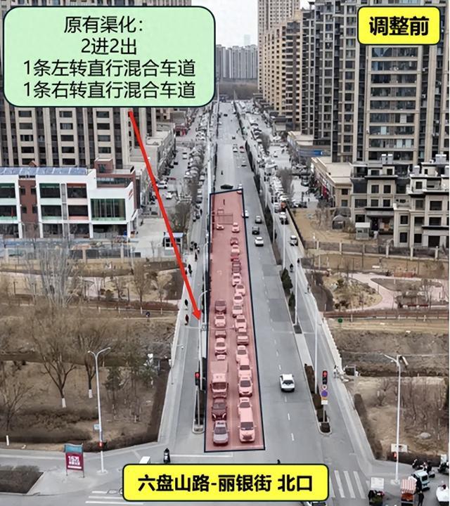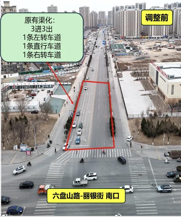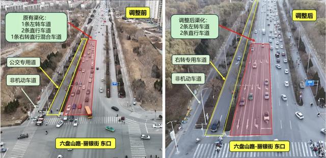 东口原设1条左转车道、2条直行车道、1条右转直行混合车道、1条公交专用道。调整后渠化为2条左转车道、2条直行车道和1条右转专用车道,同时取消原有公交专用道。