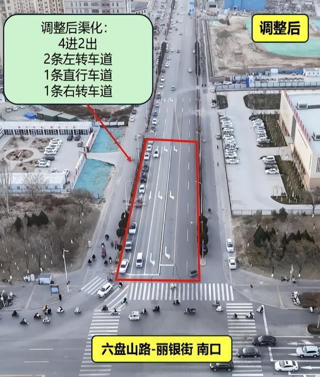 南口原来是3条进口车道+3条出口车道,进口车道为1条左转车道、1条直行车道、1条右转车道。调整后渠化为4条进口车道+2条出口车道,进口车道为,2条左转车道、1条直行车道和1条右转车道。