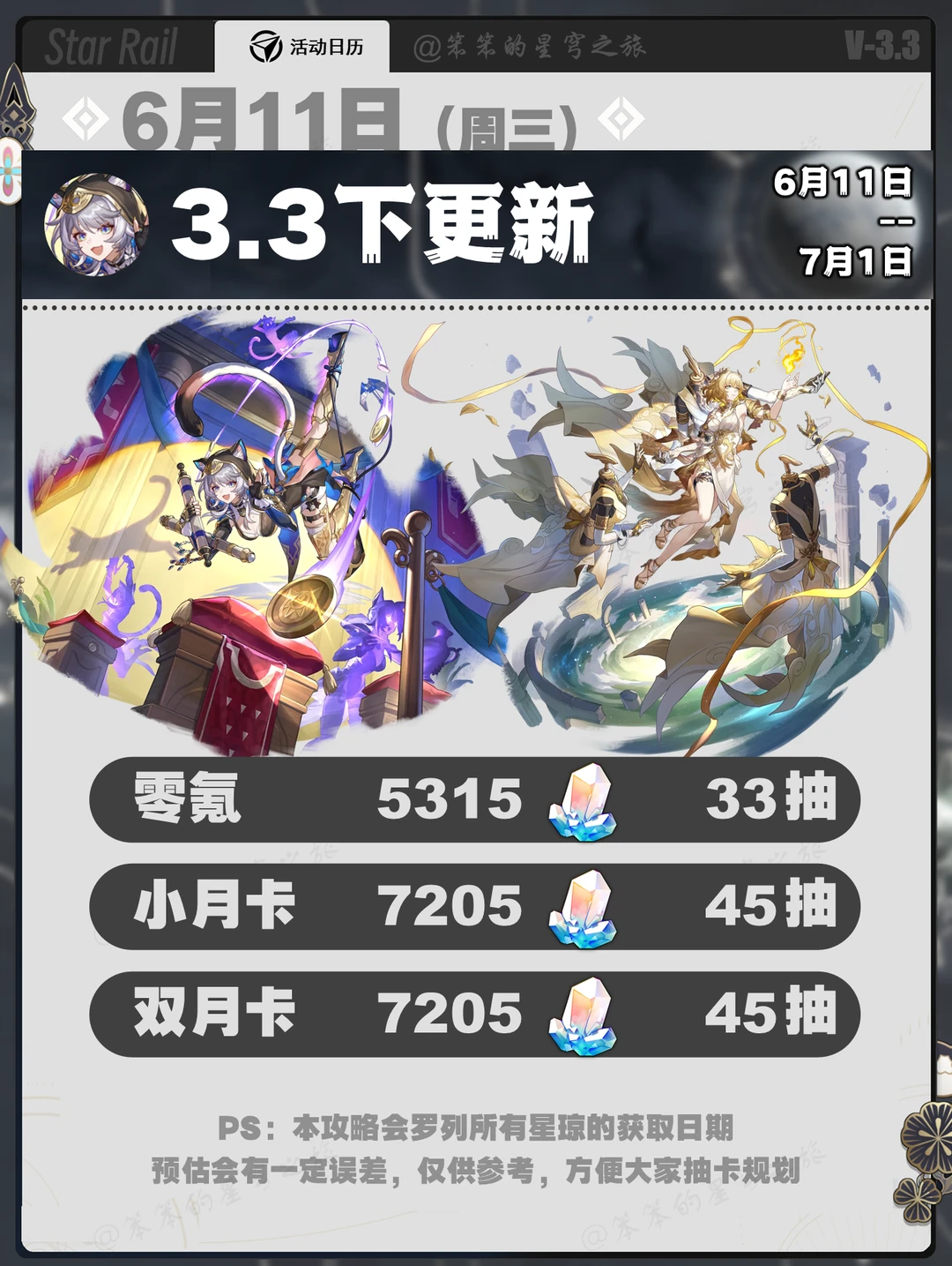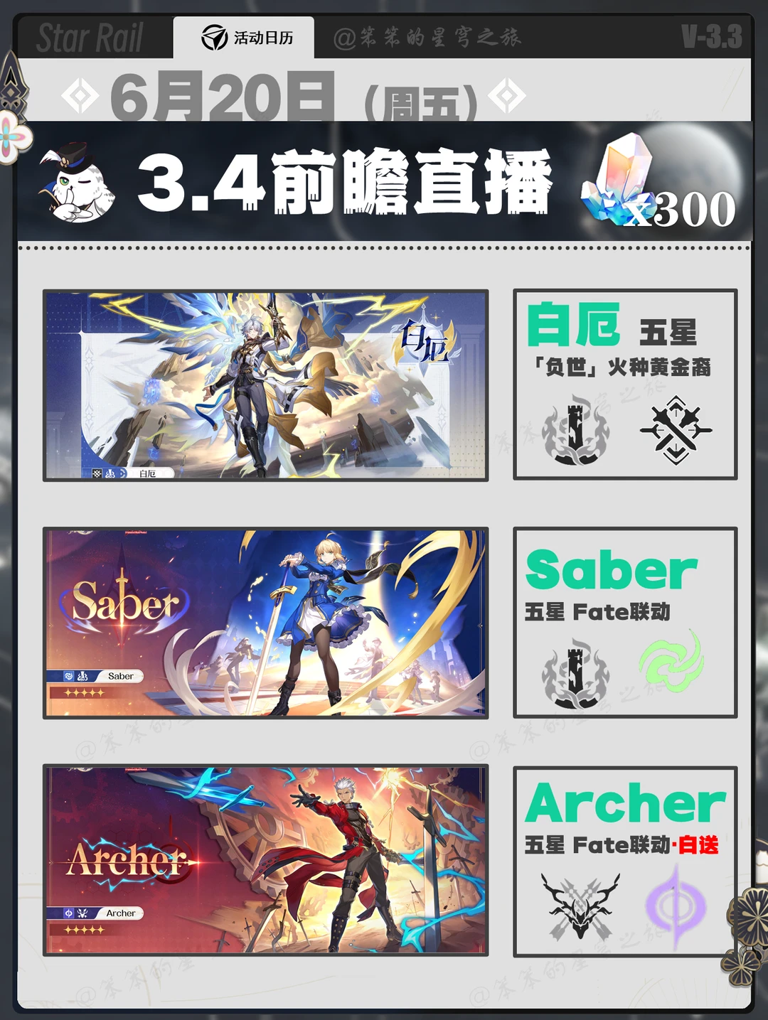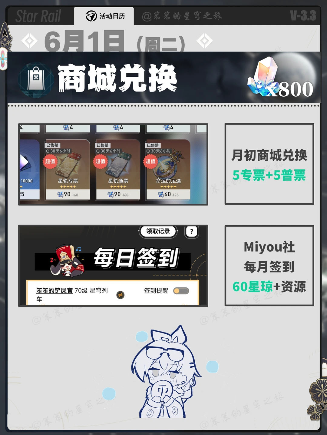 🐱大家好,我是笨笨的铲屎官 崩铁6月活动日历来了 6月重点活动: ①3.3下半赛飞儿up 本来没有抽取计划的 结果剧情加持,这下不得不抽了 ②3.5新角色立绘公布 ③3.4前瞻直播 预计还会有下一波卫星角色立绘