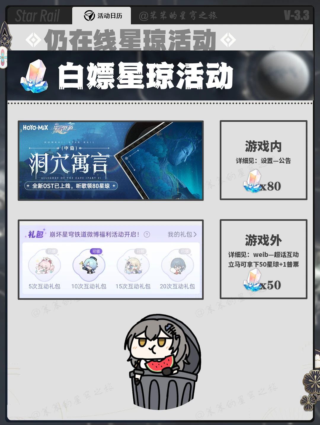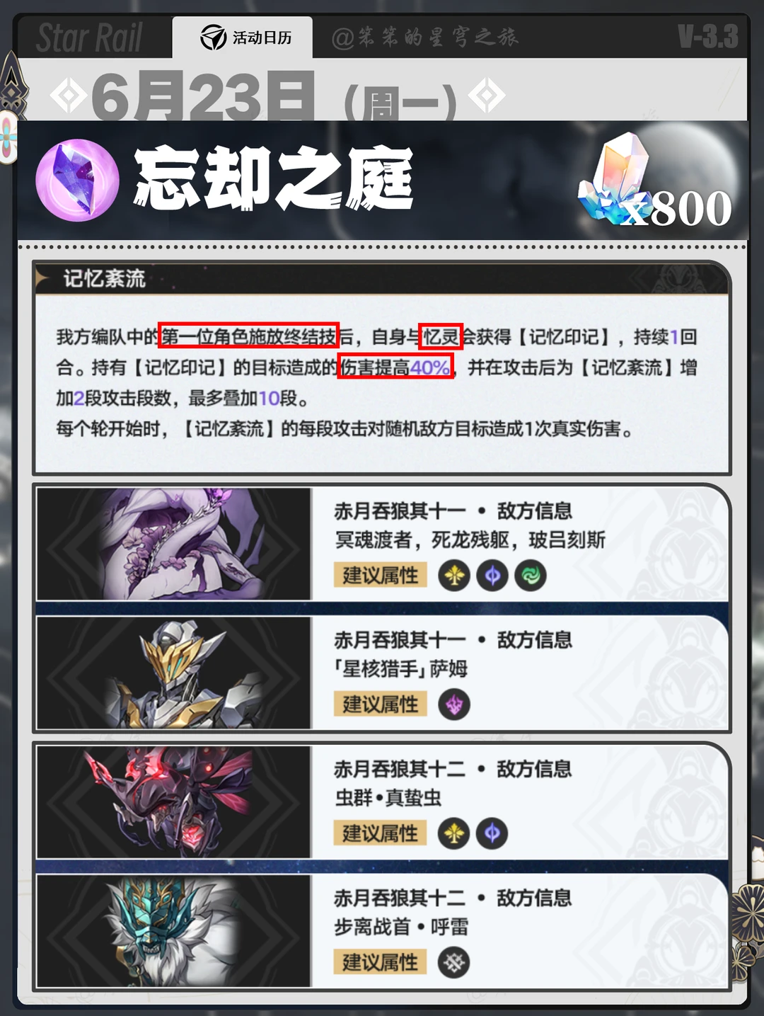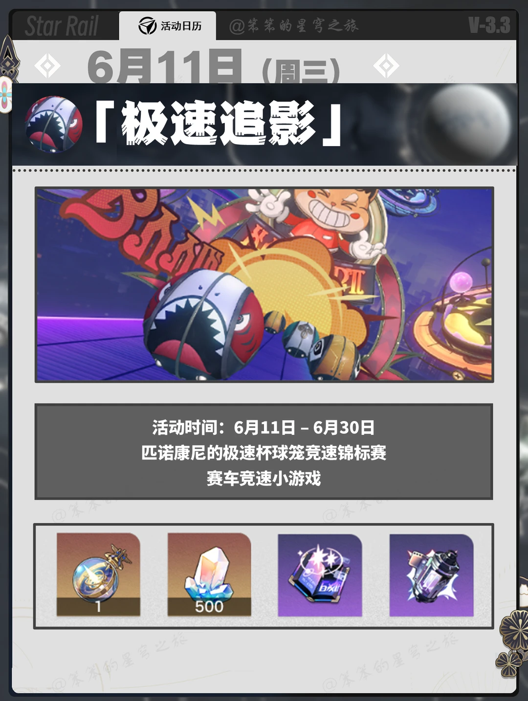 🐱大家好,我是笨笨的铲屎官 崩铁6月活动日历来了 6月重点活动: ①3.3下半赛飞儿up 本来没有抽取计划的 结果剧情加持,这下不得不抽了 ②3.5新角色立绘公布 ③3.4前瞻直播 预计还会有下一波卫星角色立绘