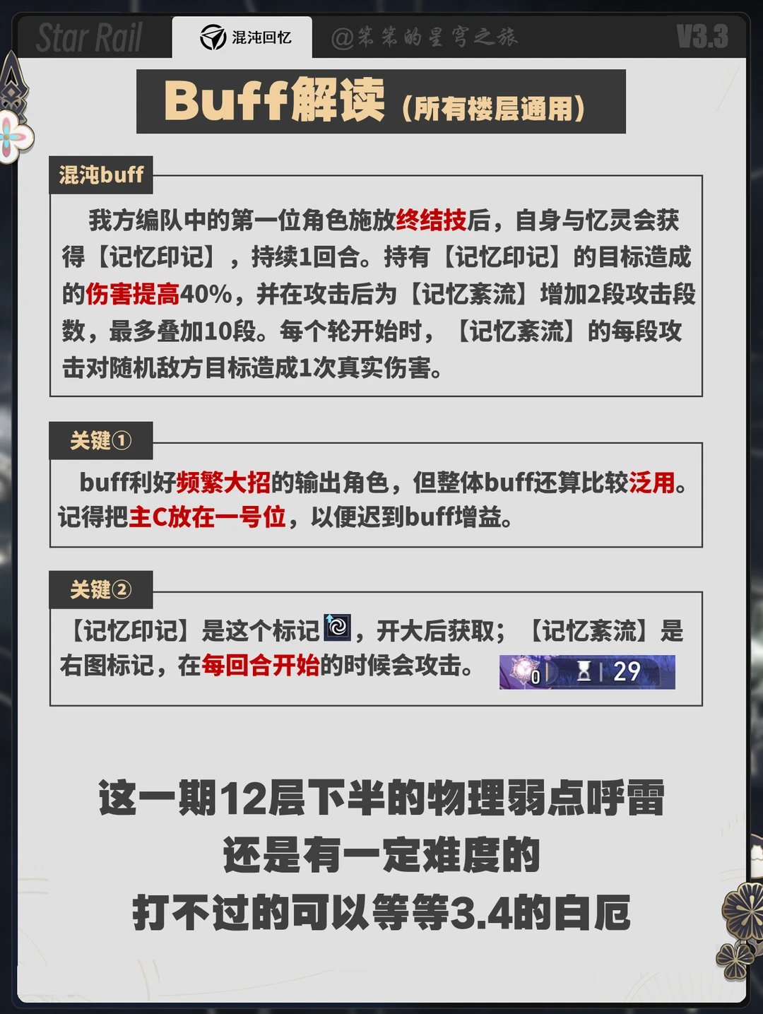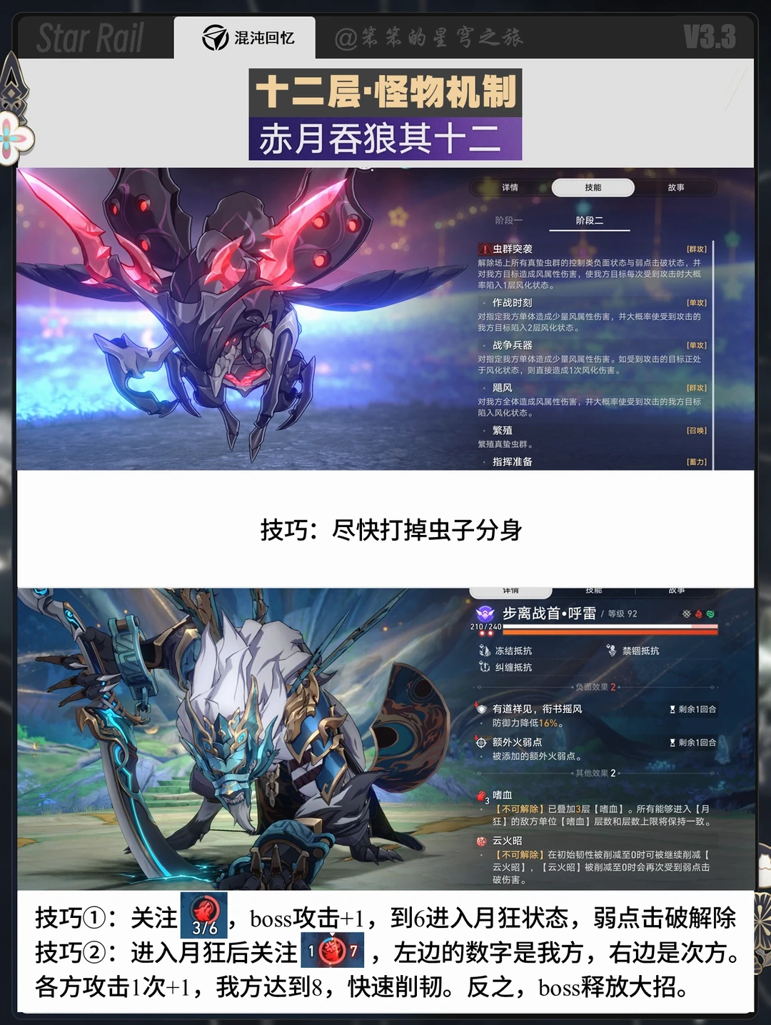 🐱大家好,我是笨笨的铲屎官 最新一期混沌回忆来了 这一期12层boss上半的虫子还比较简单 下半的呼雷就有点难了 一定要用高速的队伍 比如飞霄、阿雅之类的 在红蓝pk的时候争取赢下点数