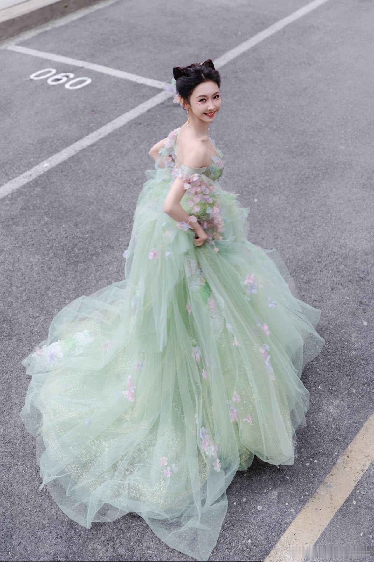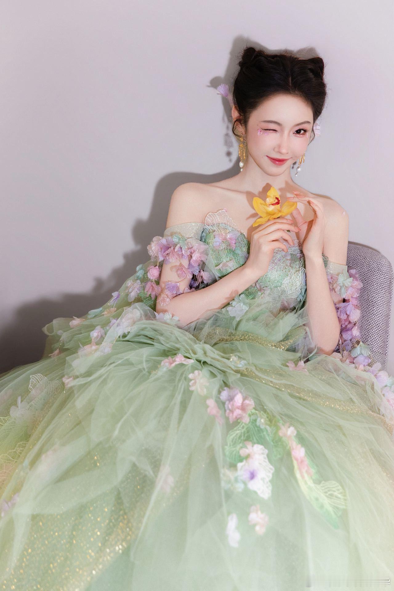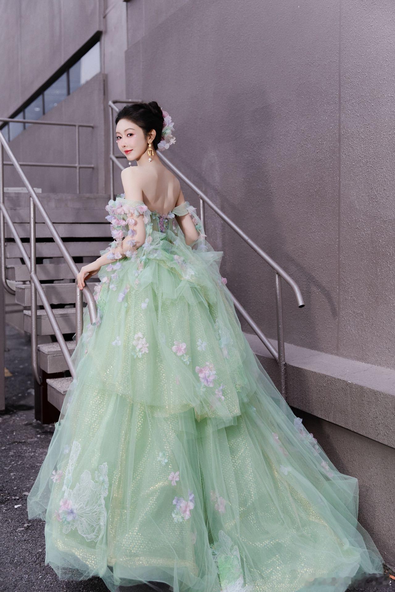 宣璐绿野精灵 宣璐这造型美到犯规!一袭绿裙缀满花朵,像从童话森林里走出来的精灵,明明是冬天,却把春天穿在了身上!