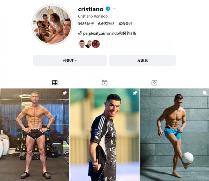 图中40岁C罗腹肌、腿部、胳膊肌肉线条夸张,宛如魔鬼筋肉人。