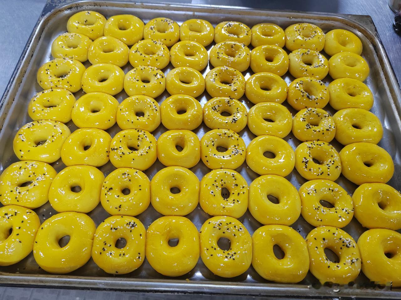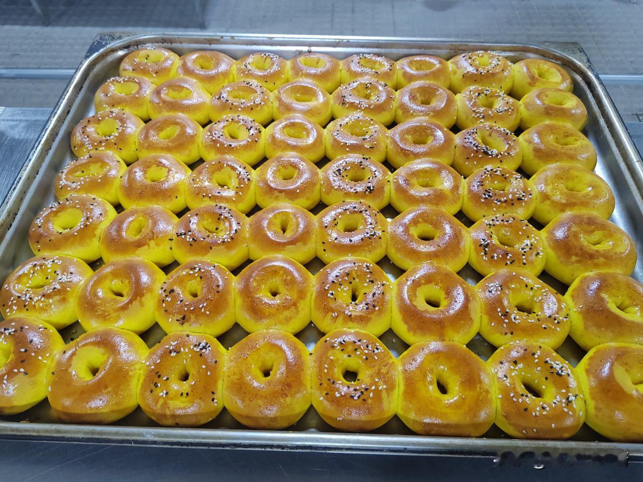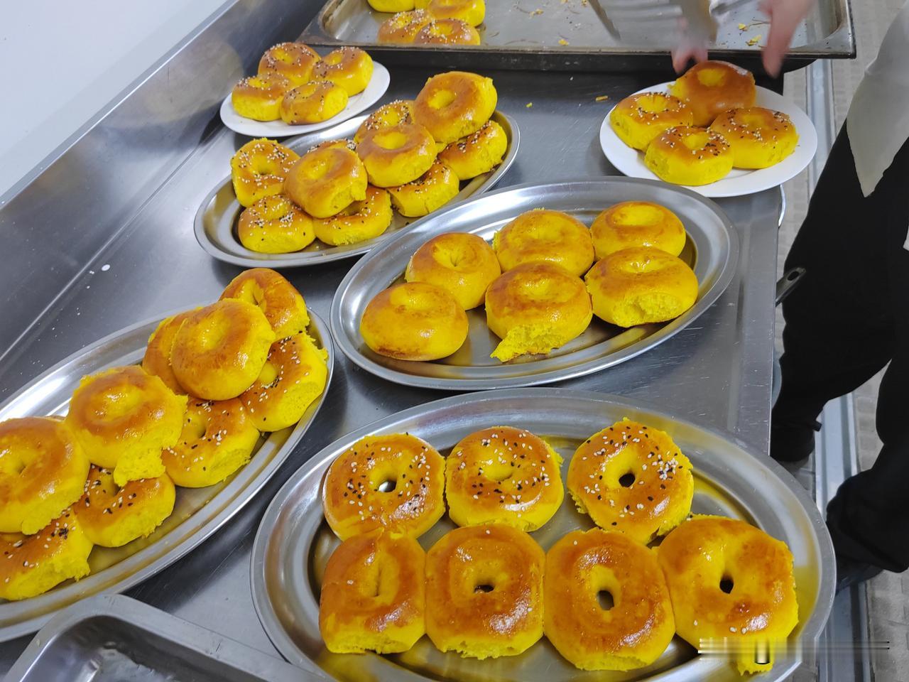 我对自己今天做的茶点,都感到十分的满意,金灿灿的,看上去很有食欲。 说实话,今天的茶点其实就是面包,加了南瓜泥,兄弟们基本上都吃完早餐了,我看还剩下了一些南瓜(蒸熟的),寻思着利用这个南瓜做个面包吧! 于是赶紧把南瓜泥弄碎,里面加了牛奶,鸡蛋,奶粉,白糖和酵母。搅拌均匀后倒入面粉中,和成面絮,再倒入一些花生油(船上没有黄油),放和面机里面搅了7-8分钟,就做成甜甜圈的形状,快做完的时候,船长来吃早餐,看到后也说,我做的茶点是越来越好了。 听到船长夸我,心里美滋滋的,怪不得做领导的都喜欢嘴巴甜的,会拍马屁的,原来是好话让人听了心里特别的舒服,哪怕是只说不做!像我这种人就比较吃亏了!