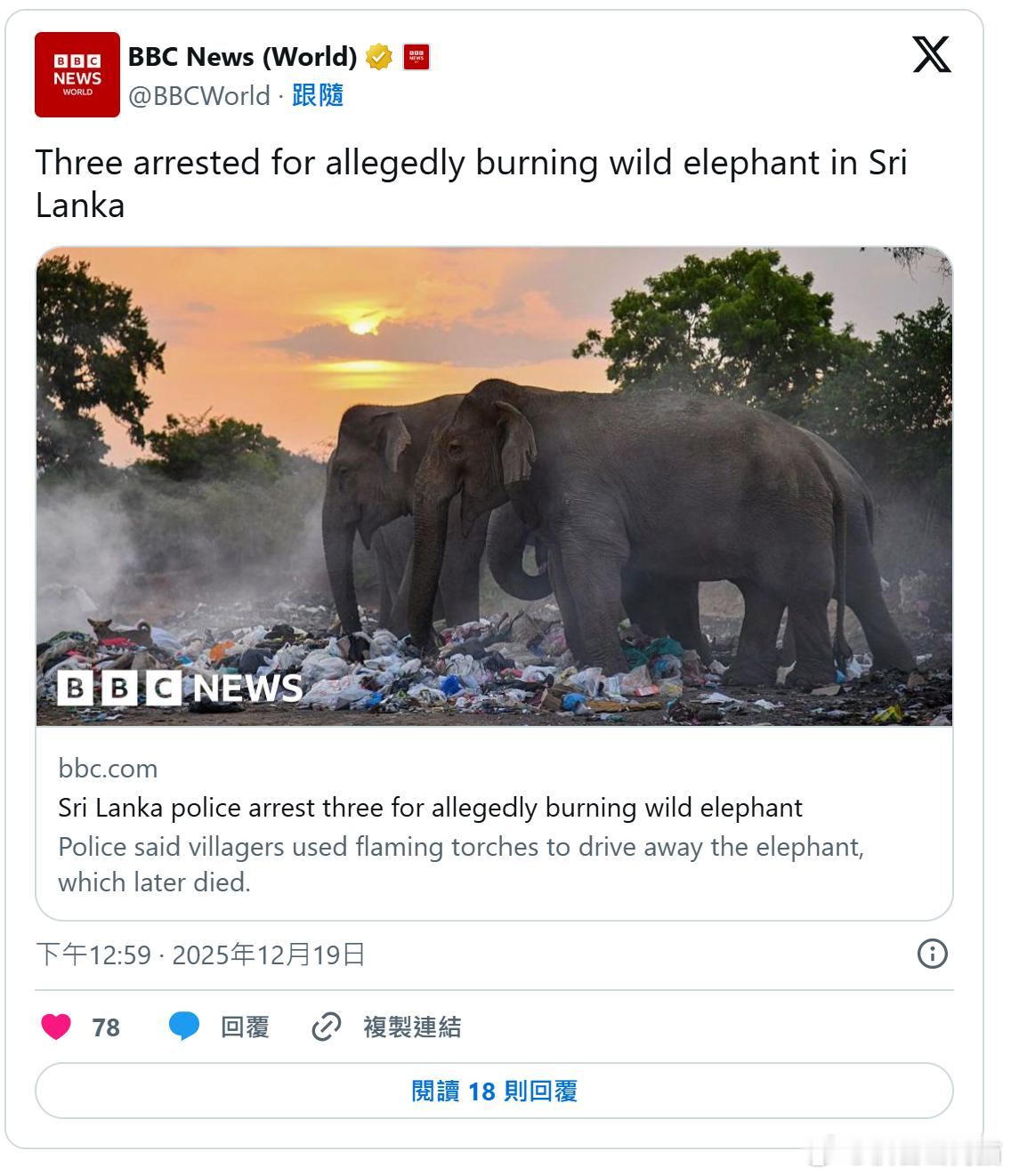 【斯里兰卡3名男子持火把驱赶野象致死引公愤,人象冲突成严峻社会问题】海外新鲜事 近日,斯里兰卡北部一处村庄发生虐杀野象事件。警方逮捕了3名涉嫌攻击野象的男子,三人使用燃烧的火把驱赶野象,导致其严重烧伤并最终死亡。相关视频在社交媒体上传播后,引发舆论强烈谴责。据英国广播公司(BBC News)报道,这头雄性野象遭火把灼烧后,身上出现大面积严重烧伤,腿部还发现枪伤。尽管兽医多次介入救治,野象仍因伤势过重不治身亡。警方表示,3名嫌疑人年龄介于42岁至50岁之间,已全部被拘捕,案件仍在进一步调查中。资料显示,这头野象今年曾多次接受兽医治疗,表明它可能长期活动在人类聚居区域附近。事件曝光后,动物保护组织和大量网民纷纷发声,强烈谴责这种残忍行为,认为已构成严重虐待动物。当地民众也发起联署,要求政府依法严惩涉案人员,并制定更有效措施,防止类似悲剧再次发生。在斯里兰卡,大象被视为神圣动物。该国多数民众信奉佛教,驯养的大象常出现在宗教仪式中,同时也是重要的旅游象征。世界自然基金会(WWF)指出,在斯里兰卡非法猎杀大象属于重罪,情节严重者甚至可能面临死刑。然而,随着人类活动范围不断扩张,人象冲突日益加剧。当地媒体统计显示,今年以来,斯里兰卡已有近400头大象死亡,同期超过100人死于大象袭击事件,凸显人象冲突已成为该国亟需正视和解决的严峻社会问题。图:斯里兰卡3男持火把驱赶野象致死,引发公愤。 (示意照)。 (美联社)