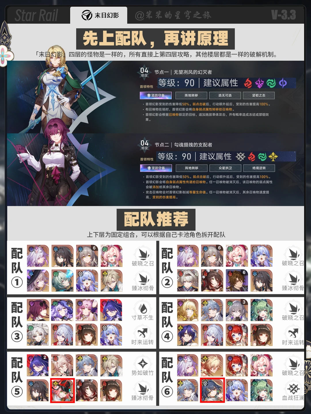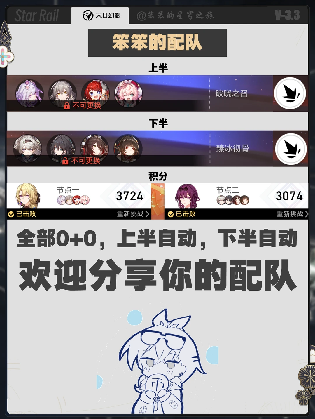🐱大家好,我是笨笨的铲屎官 末日幻影更新了 本期遐蝶、那刻夏等 老角色飞霄、流萤等都可以用 ▶上半建议用遐蝶 下班能用的队伍就很多 笨笨做了详细的罗列 希望对你有用哦