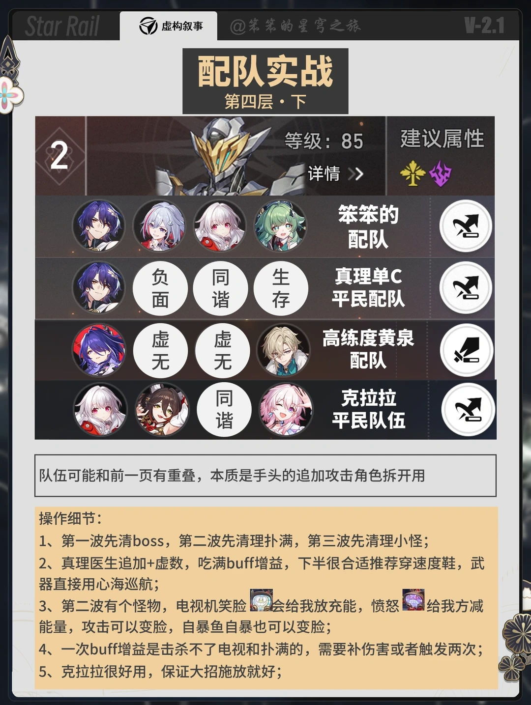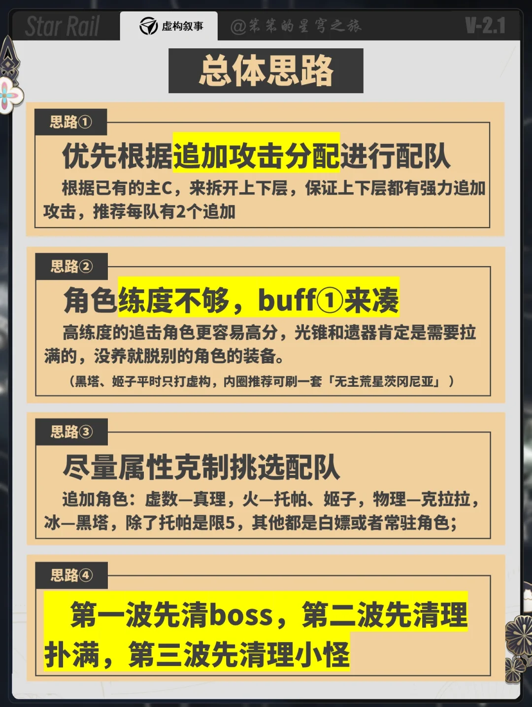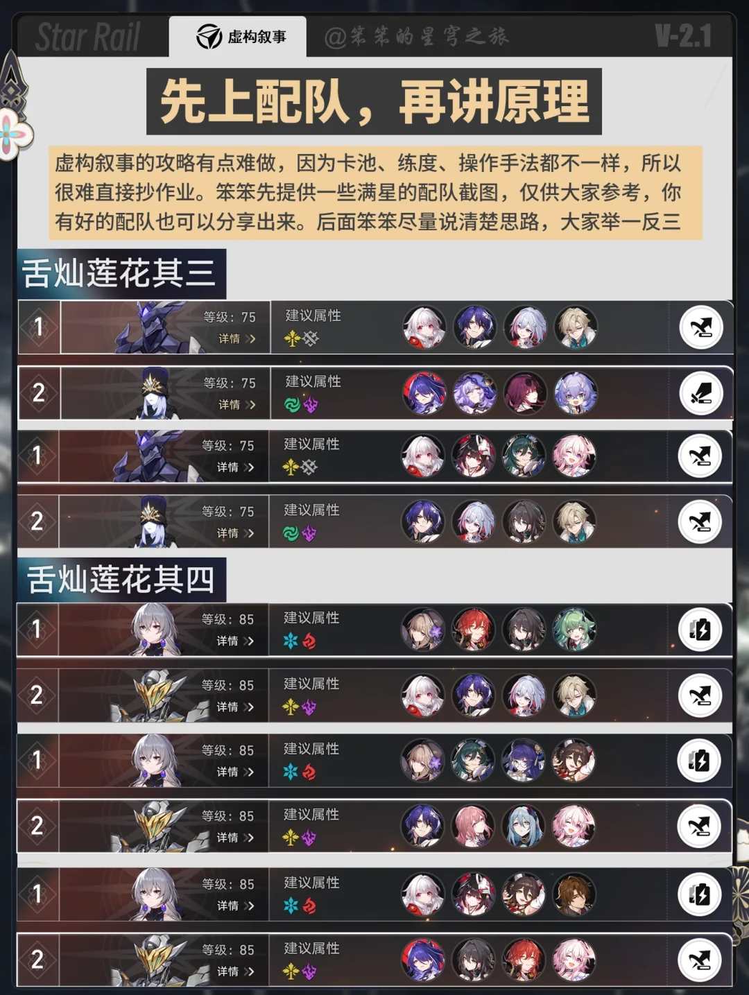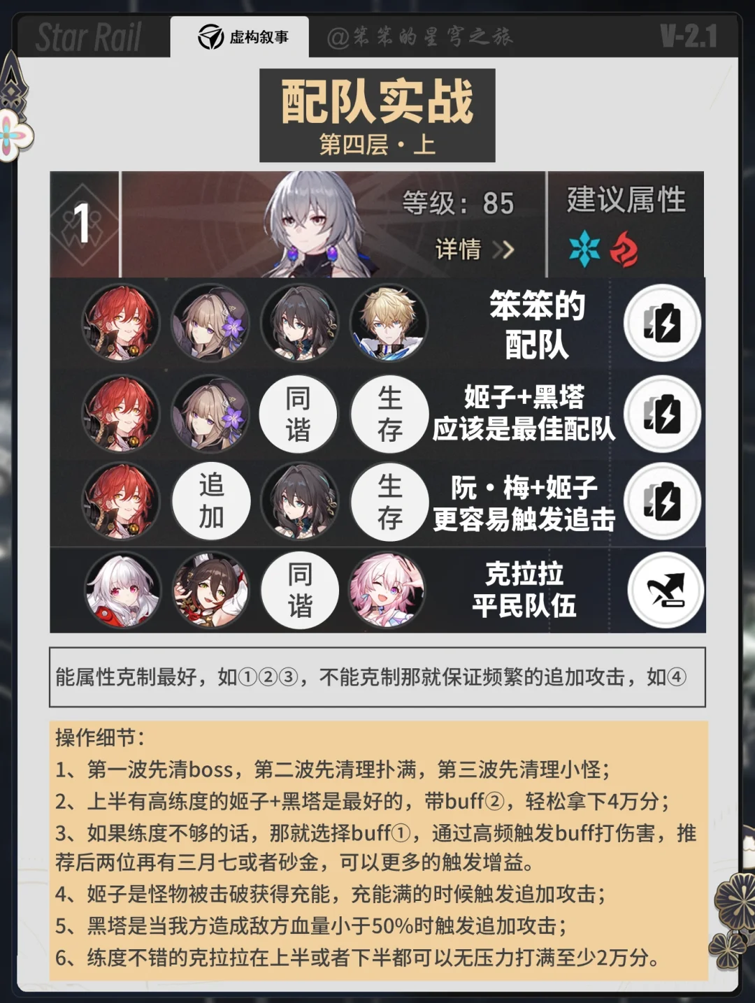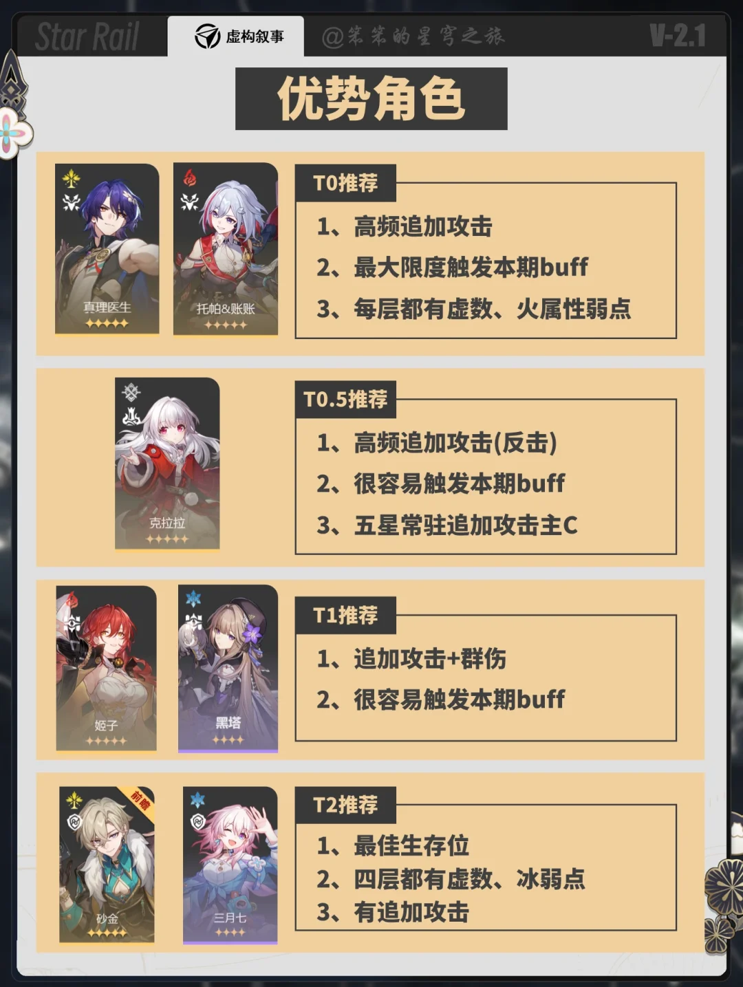 🐱大家好,我是笨笨的铲屎官 今天新的一期虚构叙事上线了 本期的增益buff利好追加攻击 义父真理医生、托帕直接起飞 克拉拉非常好用,不亏汤达人 往期平民真神姬子、黑塔依旧好用 ------------------------------- 💡虚构叙事的攻略有点难做 因为卡池、练度、操作手法都不一样 所以很难直接抄作业 所以笨笨尽量说清楚思路 大家举一反三,仅供参考 ➡最后,你有好的配队也可以分享出来