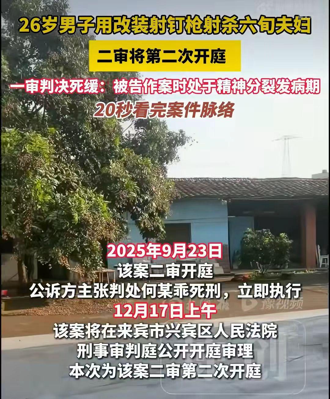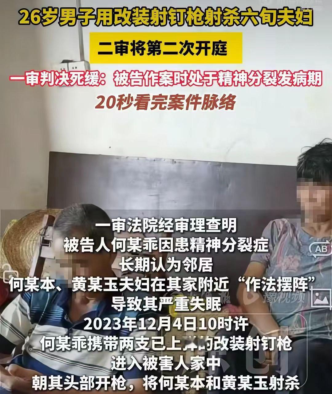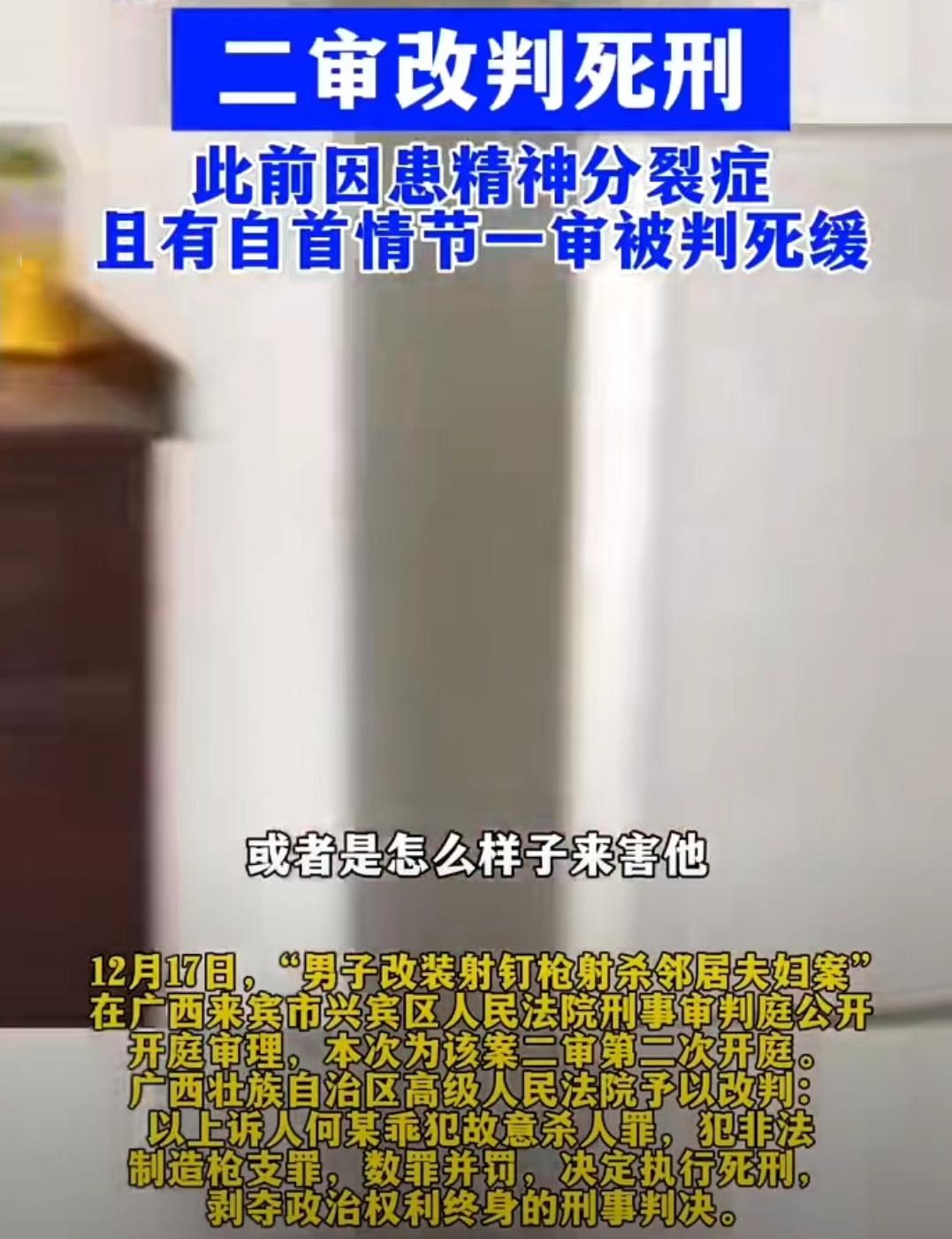 26岁男子用改装射钉枪入室射杀六旬夫妇, 终于判了,精神病不再是“免死金牌”了,一审判死缓,二审终于改判死刑。 案件经过:2023年12月4日,广西来宾市26男子何某乖带着两支改装过的射钉枪闯入邻居家将六旬的邻居夫妻俩枪杀致死。 何某乖说邻居在家“作法摆阵”,让我睡不着失眠,这就是他射杀邻居的理由。 一审时,认定作案时处于“精神分裂症发病期”,因为有自首情节,判死缓。 家属怀疑啊!精神病在发病期间,知道要把作案工具藏起来吗?知道走的时候把门关好吗?知道骑车子逃跑吗? 事后,何某讲自己持枪就是吓唬他们两个(邻居),这是吓唬吗? 问他案发经过,他却说:“不记得了,不知道。” 不知道会骑车跑了吗? 说有精神病,可是在案发前村里没有人知道何某有精神病,也没有精神病检查记录,还能正常和人交往,何某真的有精神病吗? 一审结束后,家属要求精神病重新鉴定,终于在第三次鉴定时,检方认为何某乖作案时头脑处于相对清醒的状态,经鉴定其为“限定刑事责任能力”。 二审,广西壮族自治区高级人民法院予以改判:以上诉人何某乖犯故意杀人罪,判处死刑,剥夺政治权利终身;犯非法制造枪支罪,判处有期徒刑五年:数罪并罚,决定执行死刑,剥夺政治权利终身的刑事判决。 终于所谓的精神病不再是伤害人的“免死金牌”了。 全钢炮射钉枪 精神病 冬日生活打卡季