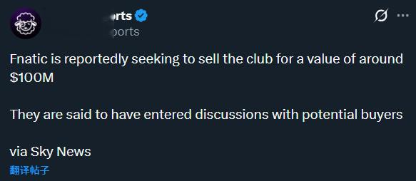 虎扑12月20日讯据天空体育报道,电竞俱乐部Fnatic目前正在考虑出售,在和潜在买家洽谈后Fnatic俱乐部的估值或将来到一亿美元。