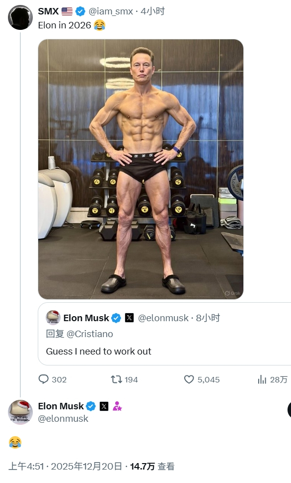 C罗身材照走红全网马斯克点评C罗身材照 C罗在社媒晒出蒸桑拿之后的半裸身材照,再次将自己雕塑般的肌肉线条展现出来,迅速引发全网热议,浏览量超过7000万。马斯克在C罗的动态下留言:我想我也是时候锻炼锻炼了。随后SMX账号晒出一张P的马斯克2026身材照,同样妥妥的肌肉男,马斯克大笑。