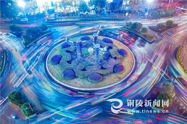 12月18日晚,淮河大道与金山大道交汇处,车流在慢门镜头下化作绚丽光轨,流动的光与静止的“丰收门”雕塑,构成一幅动静交融、古今对话的视觉画卷。(记者储著传)