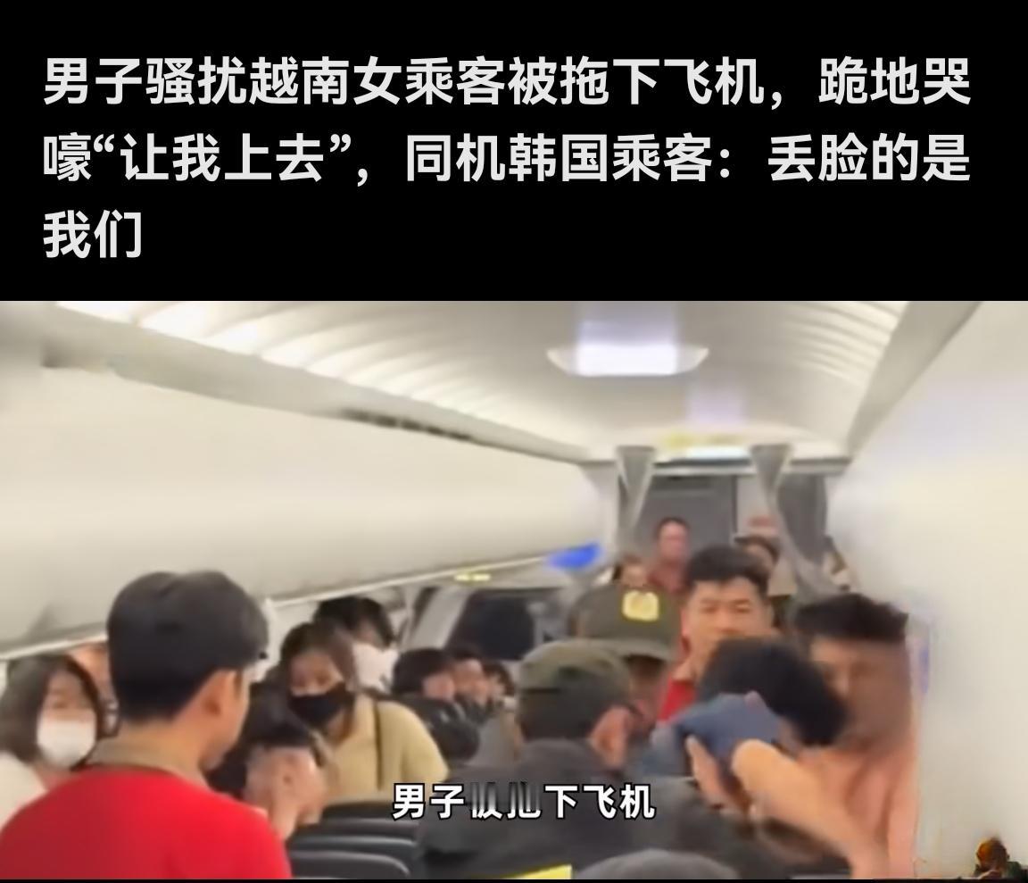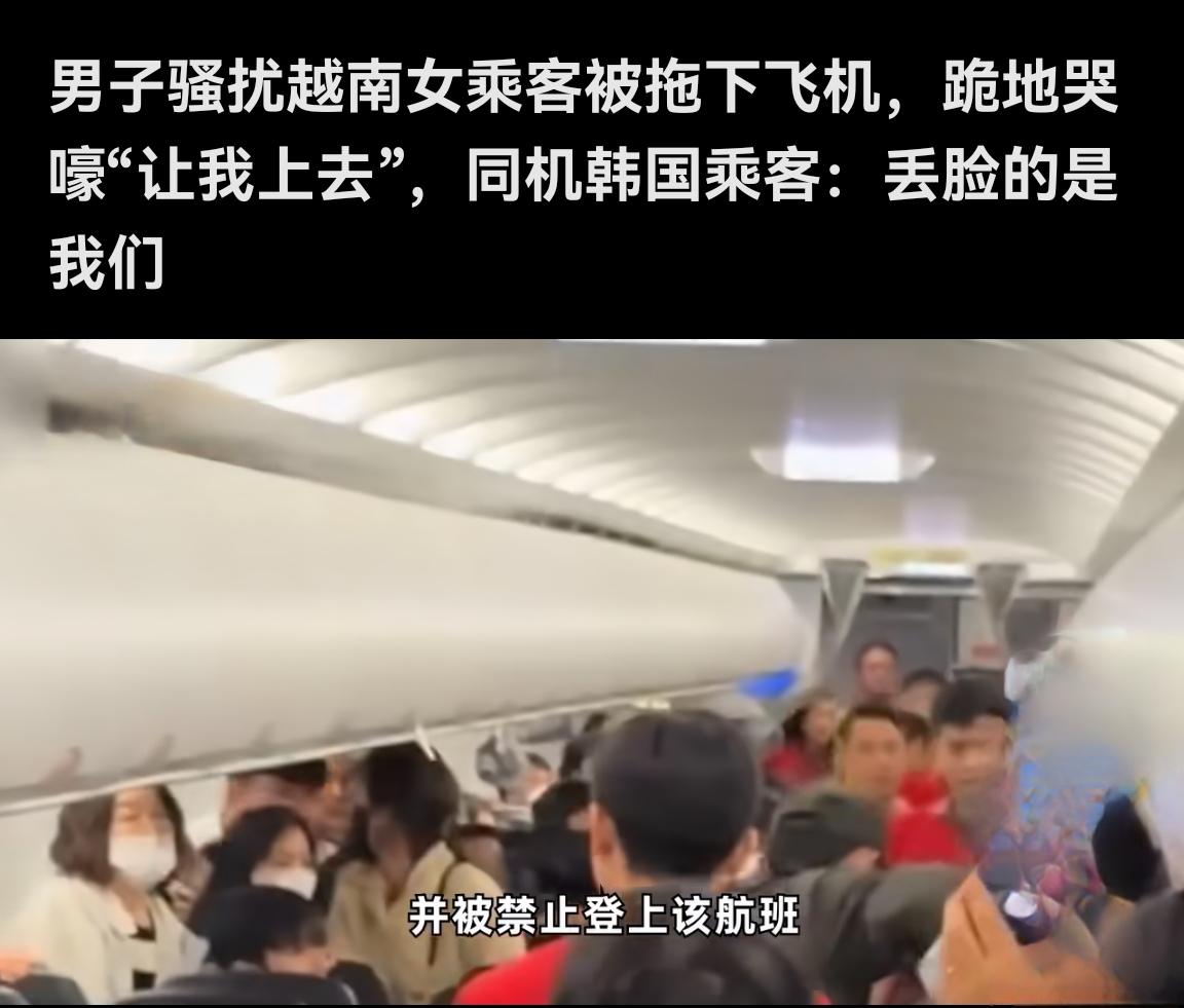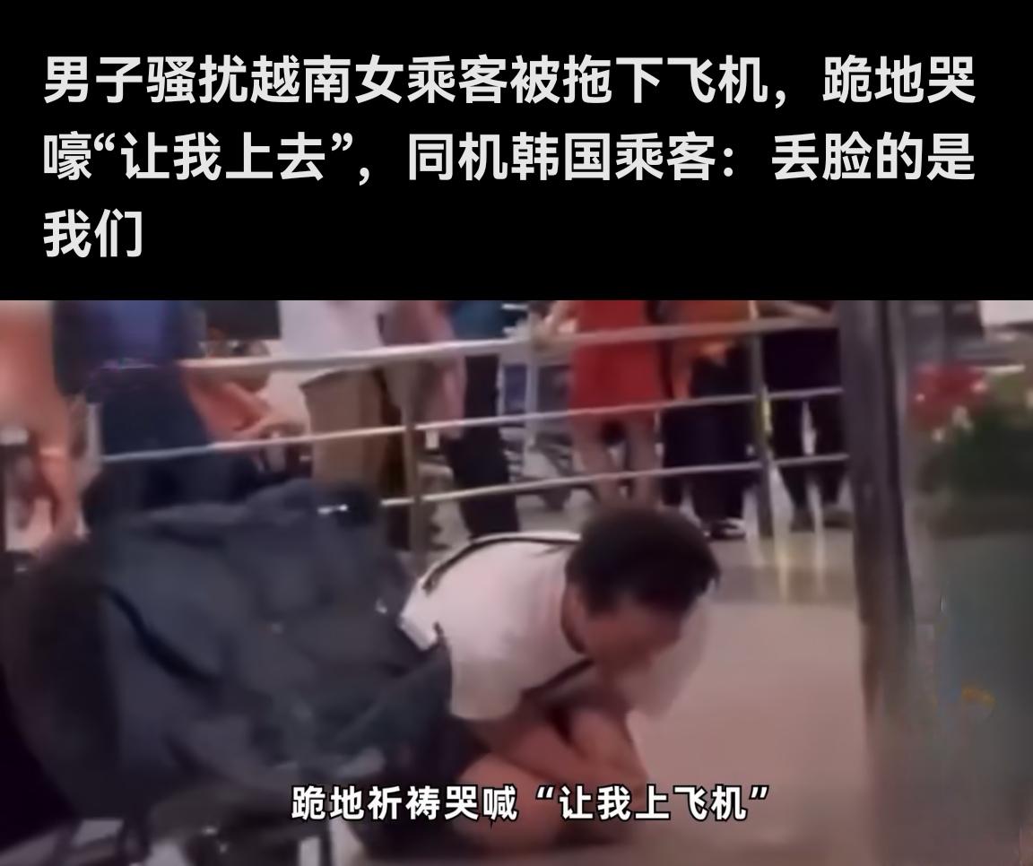 韩国人又出国整事了! 2025年12月14日,一架从越南胡志明市飞往韩国釜山的越捷航空VJ982航班上,一名韩国男子因涉嫌骚扰邻座越南女乘客引发轩然大波。据目击者描述,该男子试图进行不当肢体接触,并用“奇怪语言”骚扰对方,甚至试图亲吻女乘客头部。机组人员发现后立即介入,两名安保人员合力将其从座位上拖离,过程中男子激烈反抗,T恤被扯破后疑似更换衣物。尽管航班因此延误1小时35分钟,但机组坚持“安全优先”原则,未因准点压力妥协。 被带下飞机后,该男子在机场到达大厅跪地哭喊“让我上飞机”,其身穿印有韩国国旗的白色衬衫的画面经社交媒体传播后,引发两国网友愤怒。越南网友要求其“滚回韩国”,韩国网友则谴责其“丢尽国家脸面”,并呼吁严惩。目前,越捷航空与越南警方已介入调查,该男子被移交航空警察处理并被禁止登机。此事件再次凸显公共场合行为规范的重要性,任何个体失范都可能引发跨国舆论风波。
