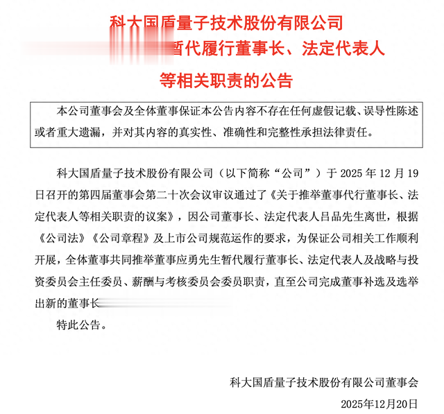 《科创板日报》12月20日讯(记者黄修眉)12月19日晚间,国盾量子发布公告称,因公司董事长、法定代表人吕品先生离世,全体董事共同推举董事应勇先生暂代履行董事长、法定代表人及战略与投资委员会主任委员、薪酬与考核委员会委员职责,直至公司完成董事补选及选举出新的董事长、相关专委会委员之日止。
