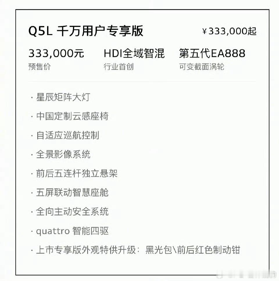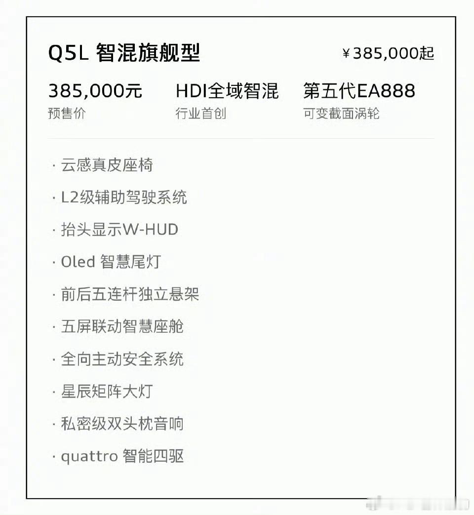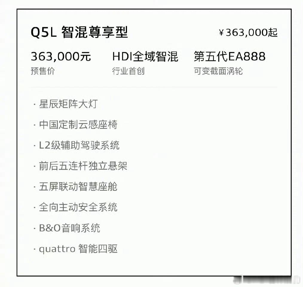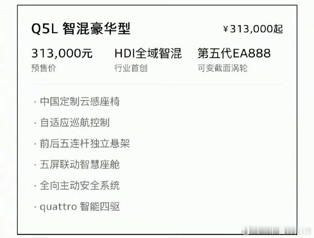 广而告之: 全新奥迪Q5L开启预售啦支持下老东家预售价: 31.3W-38.5W智驾版36.3W起