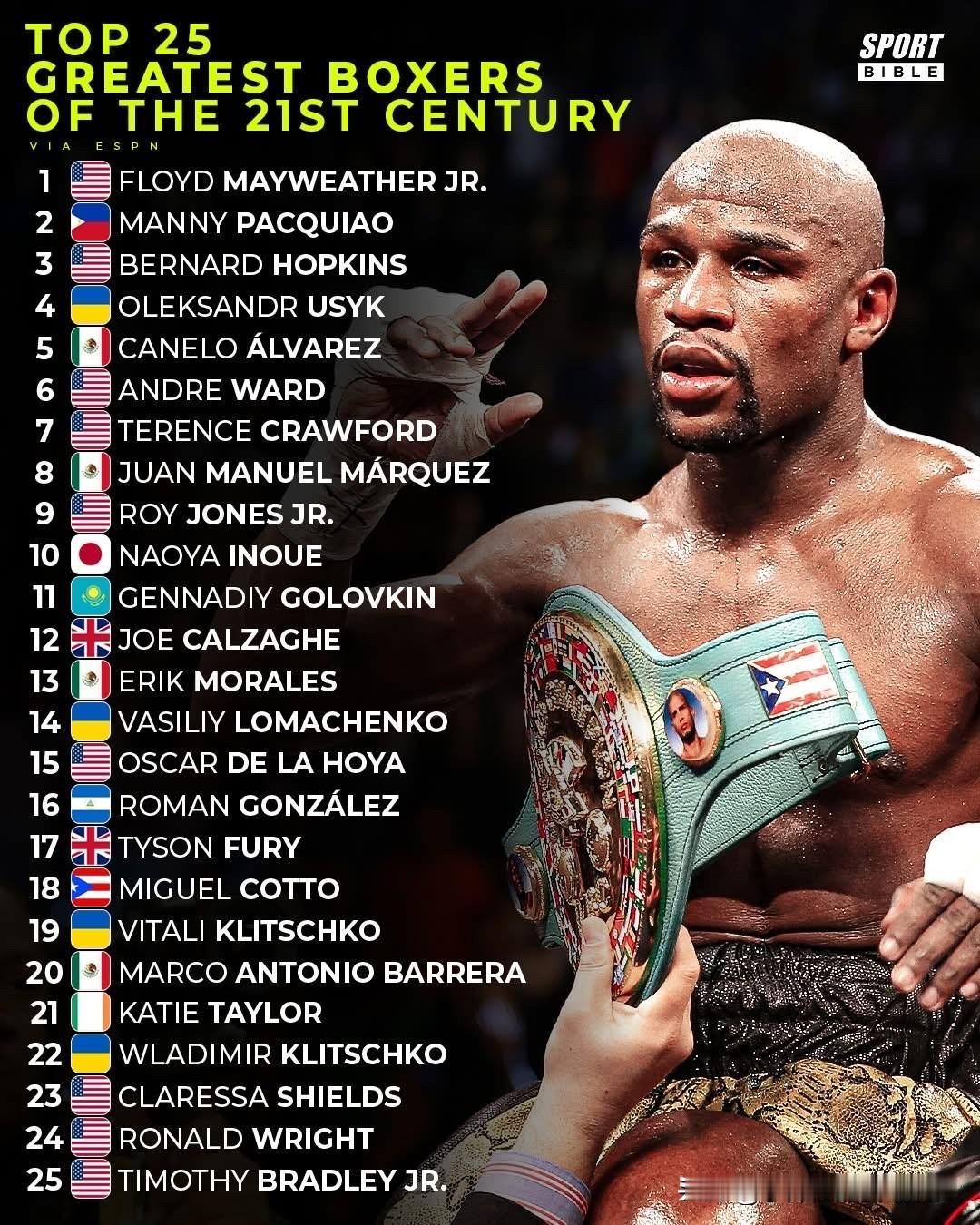 重排21世纪最伟大的前25名拳击手: 1小弗洛伊德·梅威瑟(50–0–0,27 KO) 2曼尼·帕奎奥(62–8–2,39 KO) 3伯纳德·霍普金斯(55–8–2,32 KO) 4奥列克桑德尔·乌西克(22–0–0,14 KO) 5卡内洛·阿尔瓦雷斯(60–2–2,39 KO) 6安德烈·沃德(32–0–0,16 KO) 7特伦斯·克劳福德(40–0–0,31 KO) 8胡安·曼努埃尔·马奎兹(56–7–1,40 KO) 9小罗伊·琼斯(66–10–0,47 KO) 10井上尚弥(26–0–0,23 KO) 11根纳季·戈洛夫金(42–2–1,37 KO) 12乔·卡尔扎格(46–0–0,32 KO) 13埃里克·莫拉莱斯(52–9–0,36 KO) 14瓦西里·洛马琴科(17–3–0,11 KO) 15奥斯卡·德拉霍亚(39–6–0,30 KO) 16罗曼·冈萨雷斯(51–4–0,41 KO) 17泰森·富里(34–1–1,24 KO) 18米格尔·科托(41–6–0,33 KO) 19维塔利·克里琴科(45–2–0,41 KO) 20马尔科·安东尼奥·巴雷拉(67–7–0,44 KO) 21凯蒂·泰勒(23–1–0,6 KO) 22弗拉基米尔·克里琴科(64–5–0,53 KO) 23 克拉雷莎·希尔兹(14–0–0,2 KO) 24 罗纳德·赖特(51–6–1,25 KO) 25 小蒂莫西·布拉德利(33–2–1,13 KO)