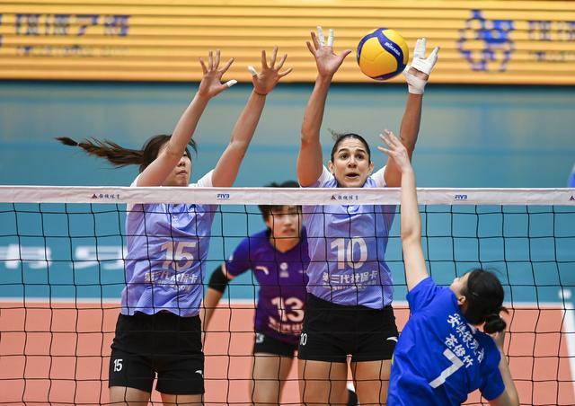 12月20日,天津渤海银行队球员夏思佳(左一)和娜塔莉亚·佩雷拉(右二)在比赛中拦网。新华社记者赵子硕摄
