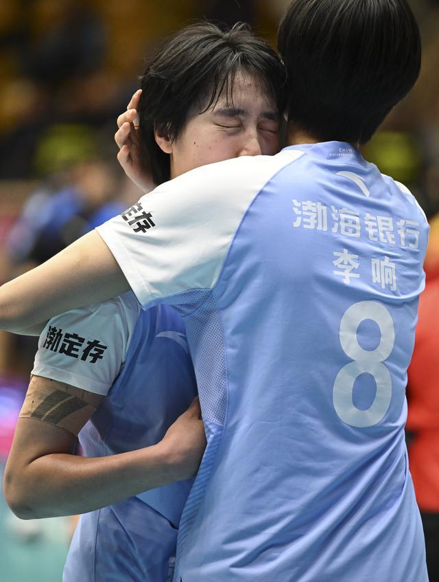 12月20日,天津渤海银行队球员李响(右)和路晶在比赛后拥抱。新华社记者赵子硕摄