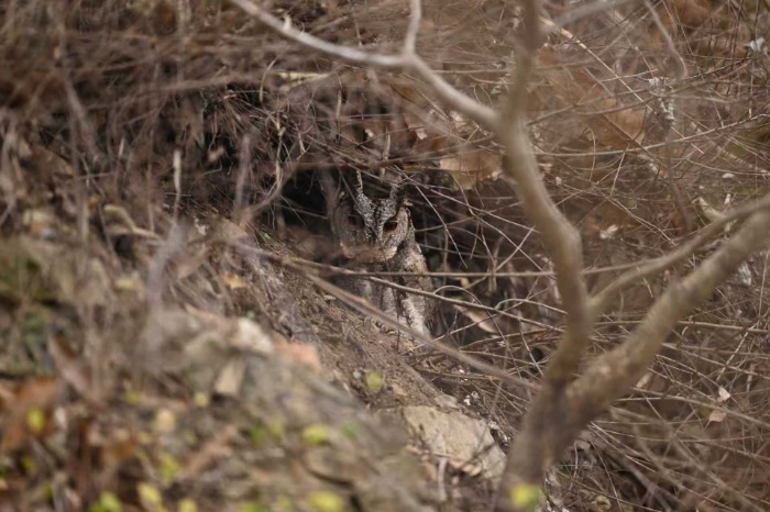 尽管两种猫头鹰栖息在同一片山地,但它们的习性略有不同:长耳鸮的食谱以啮齿类、小型鸟类为主,而北领角鸮偏好昆虫与啮齿类;其次,发现它俩时休息方式略有不同,长耳鸮站正在树上休息,而北领角鸮则在蹲地面上休憩。然而,这两种猫头鹰对栖息地要求均十分严苛,需茂密的树林供隐蔽、充足猎物及低干扰环境。