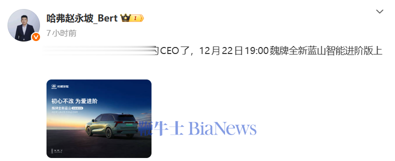 12月21日,长城哈弗品牌总经理赵永坡今日宣布接任魏牌CEO,并预告了12月22日19:00魏牌全新蓝山智能进阶版上市发布会。