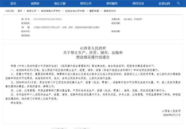 其中,宣布废止的行政规范性文件目录第39项是《山西省人民政府关于禁止生产、经营、储存、运输和燃放烟花爆竹的通告(2020年8月17日)》。
