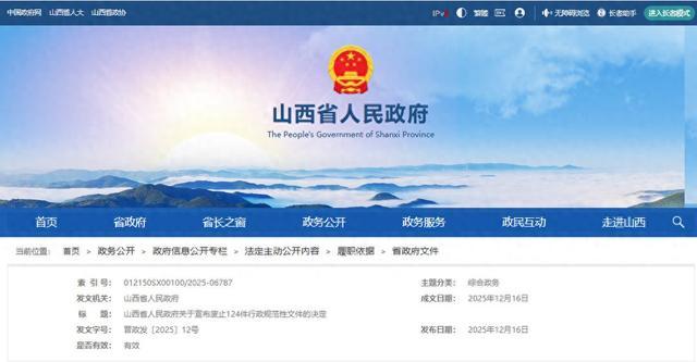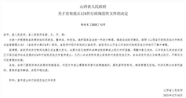 据山西省人民政府网消息,12月16日,山西省人民政府发布《山西省人民政府关于宣布废止124件行政规范性文件的决定》。