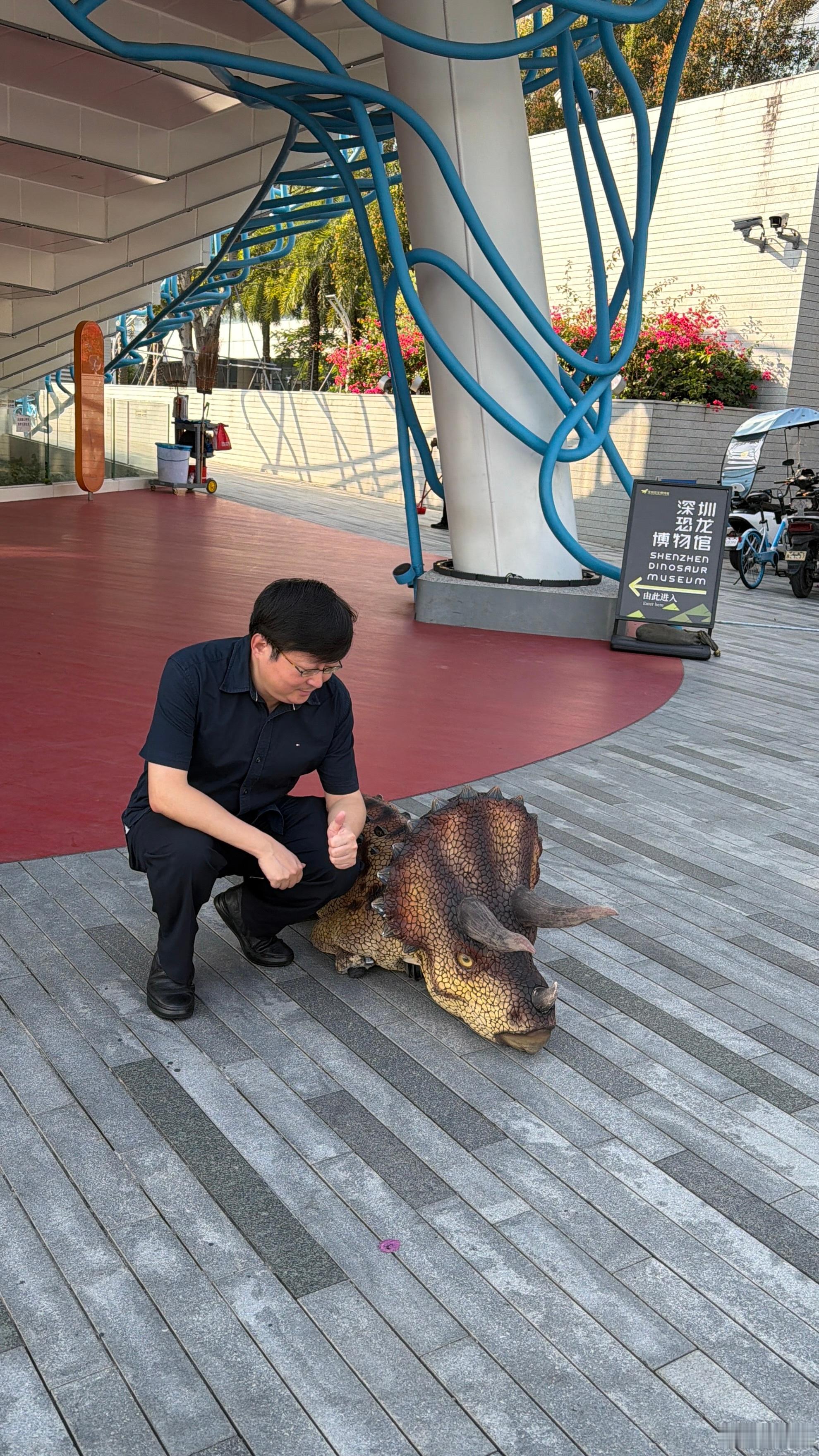 哇,今天冬至,深圳热得要命薄毛衣都穿不了,出门只能半截䄂谢谢深圳恐龙博物馆,这个暖冬刚刚开业,我来啦,看看迎宾的是什么龙,猜对有奖,它叫笨笨,竟然是活的,直接跃起,吓北方人一跳,2026继续深化拓展生命科技与人工智能!地质博物馆的恐龙,大湾区的恐龙……认识远古生命,和认识遥远星辰一样,丰富、有趣,今天这里新增的是一条恐龙长廊。 深圳