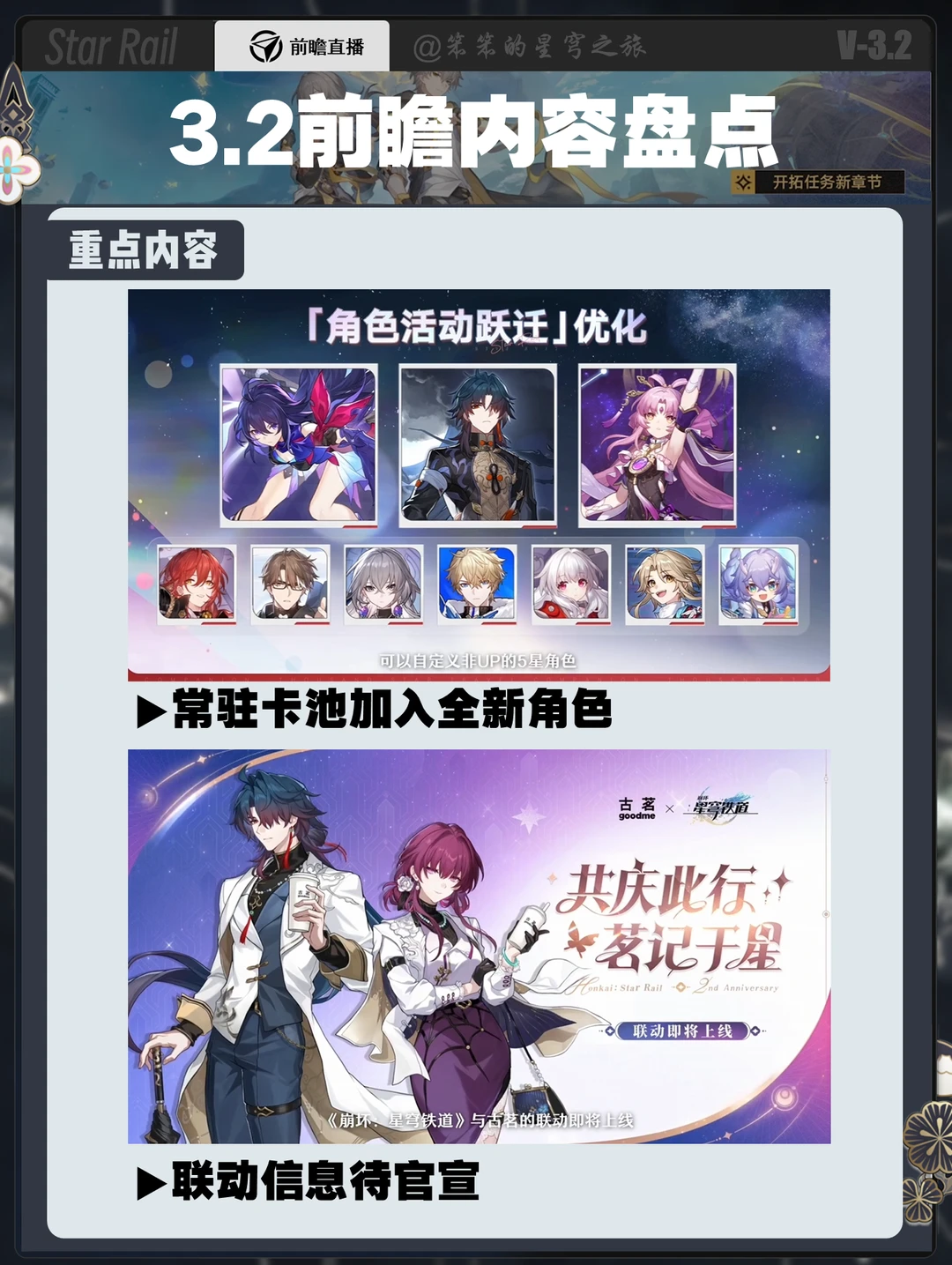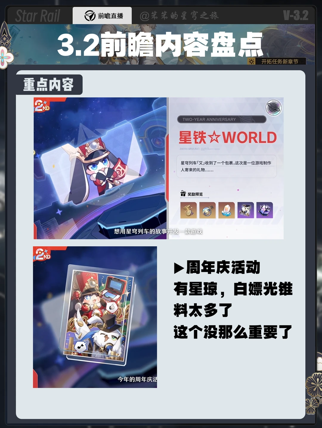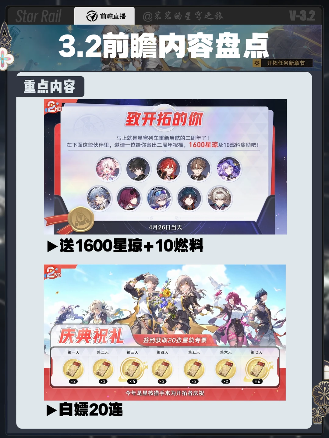 🐱大家好,我是笨笨的铲屎官 前瞻汇总来啦 周年庆奖励: ①1600星琼+10燃料 ②白嫖20专票 ③条件获取实体纪念册 ④落差&阮梅二选一,直接送 ⑤常驻卡池新增角色:希儿、符玄、刃 ⑥周年庆特别活动:和去年类型但更丰富 其他重磅消息 ①5月份音乐节 ②全新联动活动:联动角色卡夫卡、刃 ③3.8会上线匹诺康尼故事补全 ④崩坏星穹铁道 崩坏星穹铁道创作者激励计划