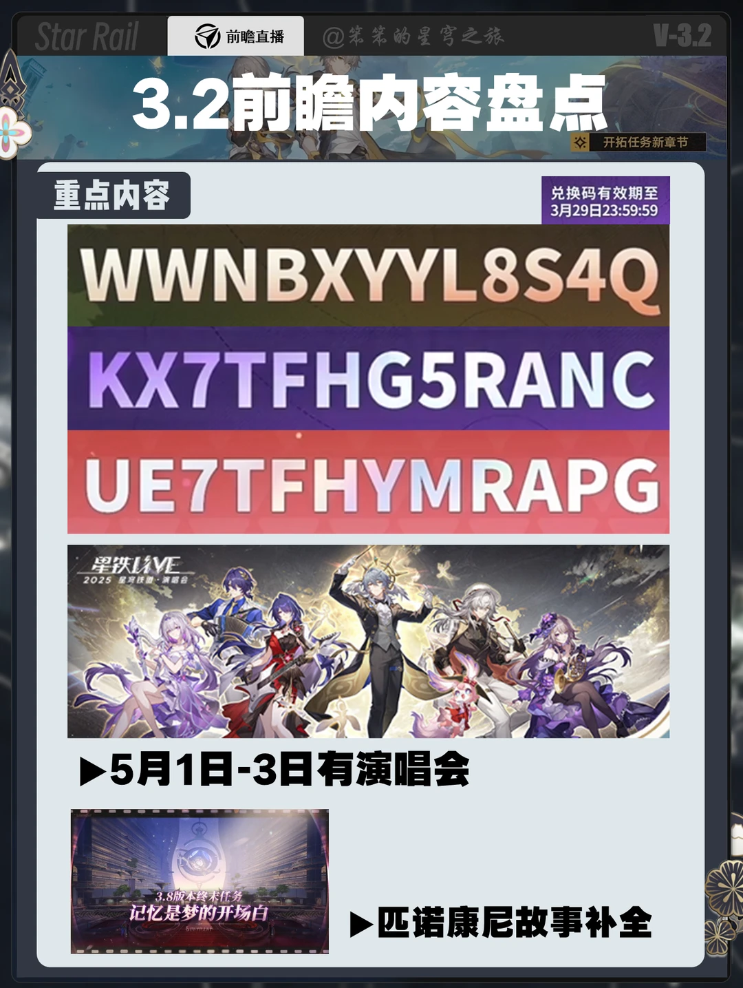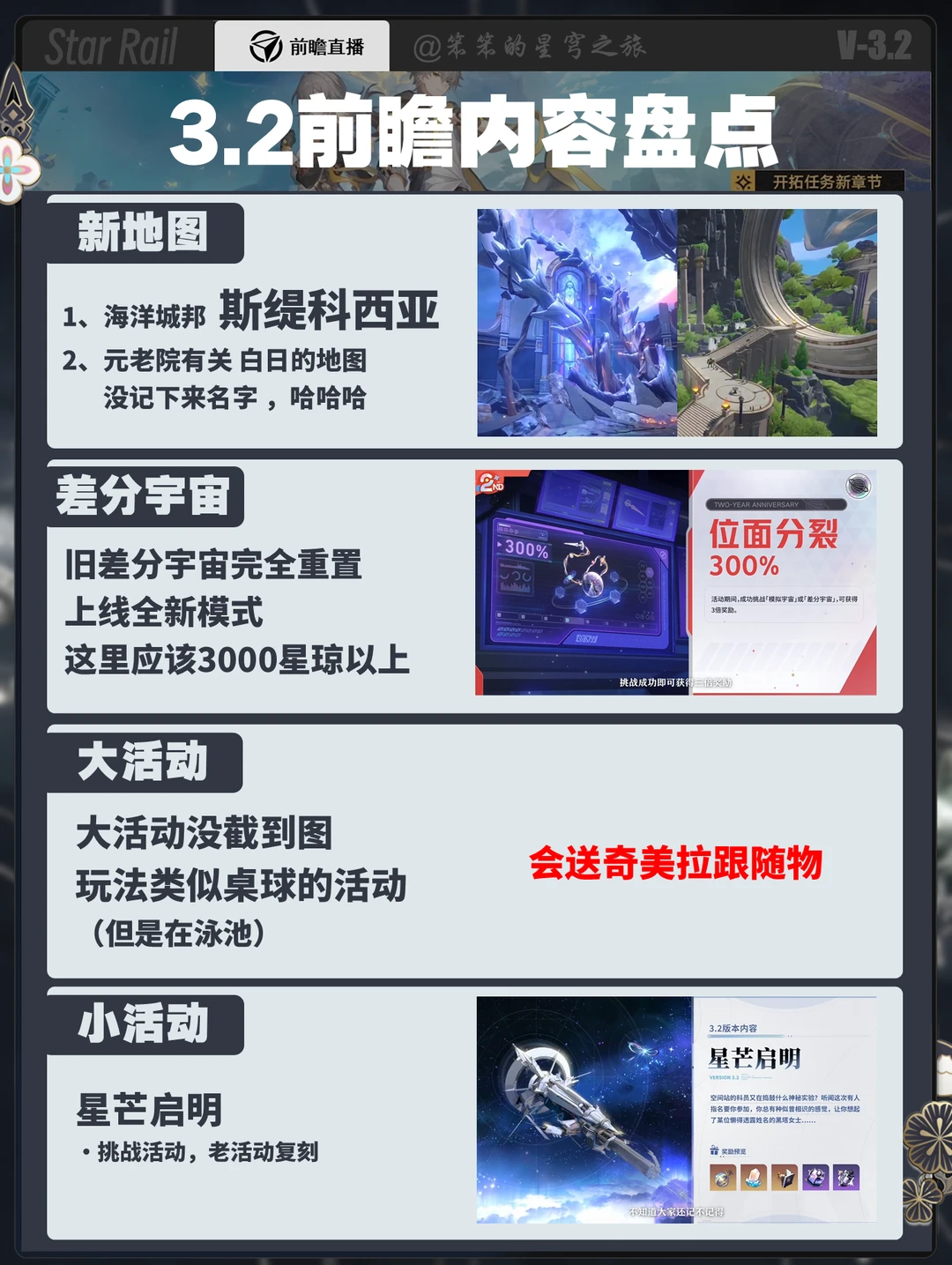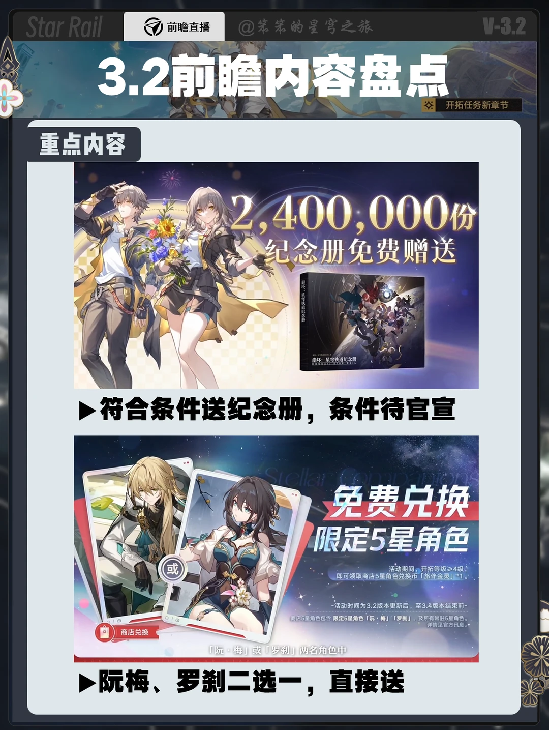 🐱大家好,我是笨笨的铲屎官 前瞻汇总来啦 周年庆奖励: ①1600星琼+10燃料 ②白嫖20专票 ③条件获取实体纪念册 ④落差&阮梅二选一,直接送 ⑤常驻卡池新增角色:希儿、符玄、刃 ⑥周年庆特别活动:和去年类型但更丰富 其他重磅消息 ①5月份音乐节 ②全新联动活动:联动角色卡夫卡、刃 ③3.8会上线匹诺康尼故事补全 ④崩坏星穹铁道 崩坏星穹铁道创作者激励计划