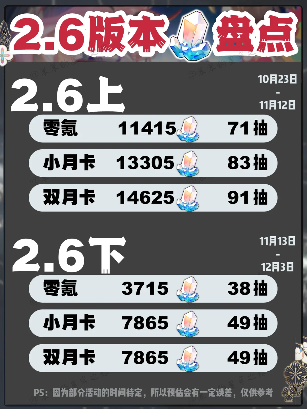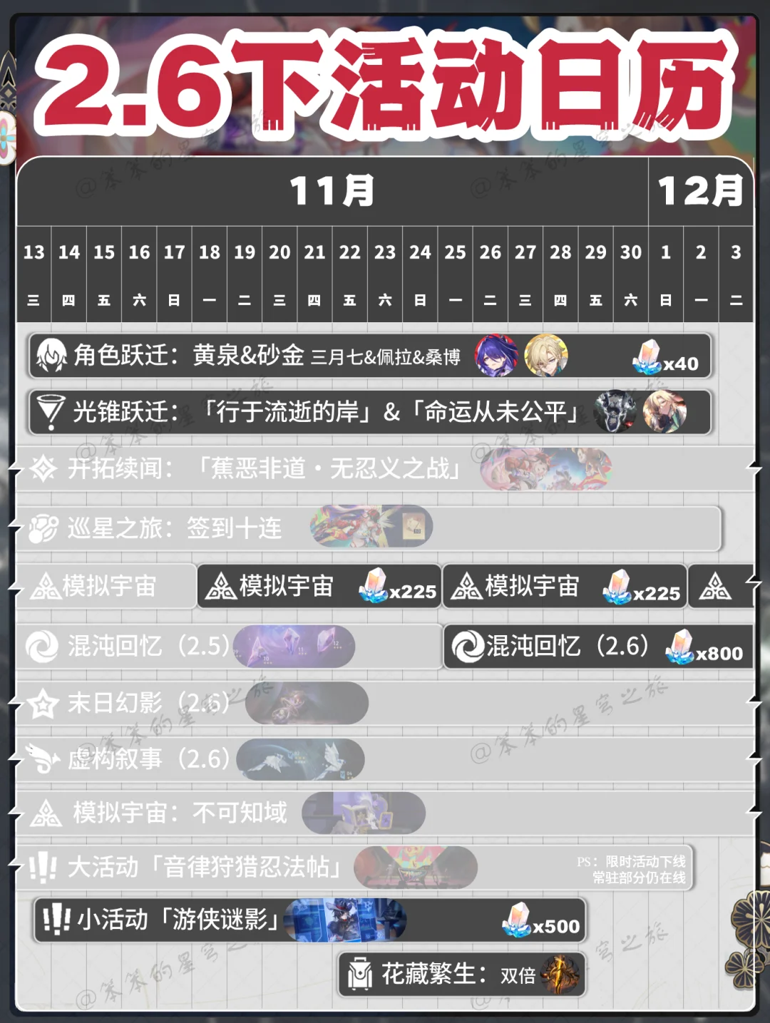 🐱大家好,我是笨笨的铲屎官 今天给大家带来的是2.6版本活动的日历 2.6全部活动的排期和获取星琼数都上线啦 有需要的可以保存 不错过2.6所有活动