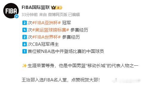 王治郅入选国际篮联篮球名人堂 王治郅成为第五位入选FIBA名人堂的国人,前四位分别是牟作云(2019年,教练身份)、郑海霞(2021年)、姚明(2023年)、苗立杰(2024年)。2026年国际篮联篮球名人堂,大郅和诺维茨基(世锦赛MVP)、特科格鲁(世锦赛亚军)等名将同批次入选,这是一份含金量十足的荣誉,大郅入选实至名归。当然,FIBA列出的荣誉并不全面也不太准确。大郅是四届亚锦赛冠军(1995年、1999年、2001年、2011年),FIBA只写了两届亚洲杯冠军(2001年和2011年)。他是首位在NBA登场比赛的亚洲球员,但首位被NBA选中的球员不是大郅,而是1987年被老鹰队选中的宋涛。大郅是CBA六连冠,但他有七个CBA冠军。另外他还是三届亚运会冠军(1998年、2006年、2010年),但这是亚奥理事会的比赛,所以FIBA没有统计亚运会的荣誉。