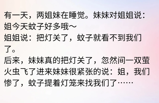 妹妹很紧张的说:姐,我们惨了,蚊子提着灯笼来找我们了..