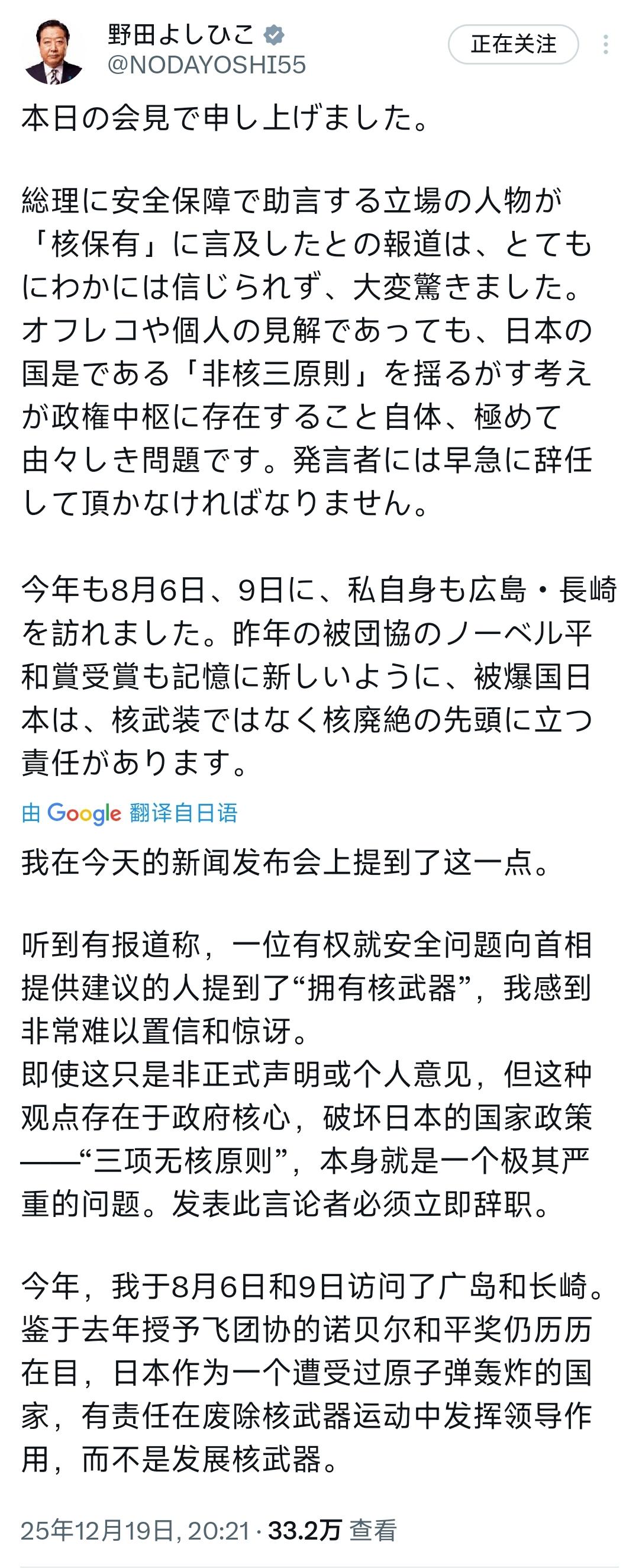 日本立宪民主党党首、前首相野田佳彦昨晚(12月19日晚)发文写道:“我在今天的新闻发布会上提到了这一点。 听到有报道称,一位有权就安全问题向首相提供建议的人提到了‘拥有核武器’,我感到非常难以置信和惊讶。 这脸打得真响啊。当年挨了原子弹,现在自己人倒想搞核武器?忘了广岛长崎的惨状了吗?历史课都白上了。 自家后院的核电站事故都收拾不利索,还惦记玩核弹?这种话从政府高官嘴里冒出来,别说邻居们害怕,全世界都得捏把汗。信任一旦丢了,可难找回来。 和平宪法还在那儿摆着呢,这边就有人做梦当“正常国家”想拥核?这不叫强军,这叫玩火。忘了“无核三原则”是谁定的国策了?自己拆自己的台。 最该反对核武器的国家,居然有人公开讨论要拥有它。这让那些一直相信日本走和平路线的周边国家怎么想?晚上还能睡得着觉吗? 光惊讶和批评可不够。谁说的,就得让他立刻下台。政府更需要给全国、给全世界一个白纸黑字的保证:这条路,死都不会走。