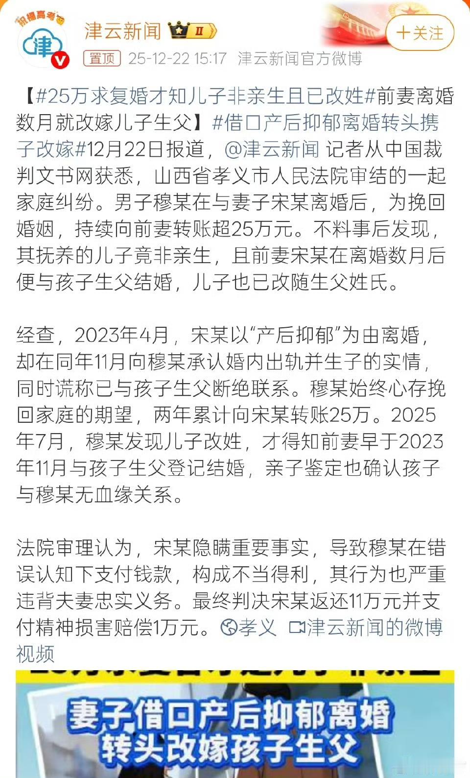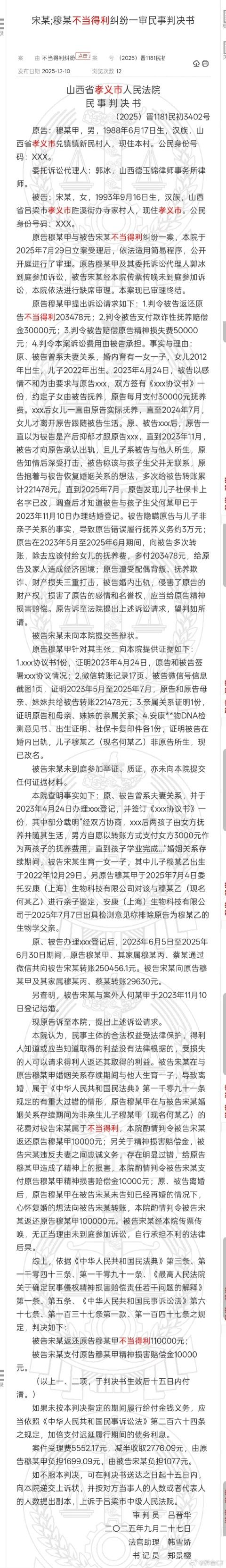 这案子,看的我直呼大受震撼。 据裁判文书,原被告曾系夫妻关系,婚内育有一双子女,女儿2012年出生,儿子2022年出生。 2023年4月,女方以感情不合为由,要求与男方离婚,孩子均归女方抚养,原告每月支付30000元抚养费。(注:经校对:此处应为3000元。 但两人离婚后,女儿一直跟男方,直到2024年7月才转跟女方。 两人离婚后,男方一直以为是女方产后抑郁才跟自己离婚,直到2023年11月,女方向男方坦诚自己出轨,且儿子是她跟第三者所生。 不过女方表示,自己跟孩子生父没有联系。 于是,抱着和女方复婚的想法,男方开始给女方转账,合计22.2万,直到2025年7月,才发现儿子的姓氏变更为生父姓氏。 调查后更是得知,女方早于2023年11月就已经跟孩子生父办理了婚姻登记。 然后,男方就向法院起诉离婚,要求女方返还不当得利20.3万,支付欺诈性抚养赔偿金3万,同时赔偿自己精神损失费5万。 男方认为,①女方隐瞒他与儿子非亲子关系的事实,导致他错误履行抚养义务约3万元;②他在2023年5月-2025年6月期间,向女方多次转账,除去应该付给女儿的抚养费,多付203478元,给他及家人造成经济困境;③他遭受配偶背叛、抚养欺诈、财产损失三重打击,女方婚内出轨,侵害了他的财产权,损害了他的感情和名誉权,应当给他精神损害赔偿。 法院审理后判决,女方返还不当得利11万,同时赔偿男方精神损害赔偿金1万。两孩非亲生 两子非亲生案